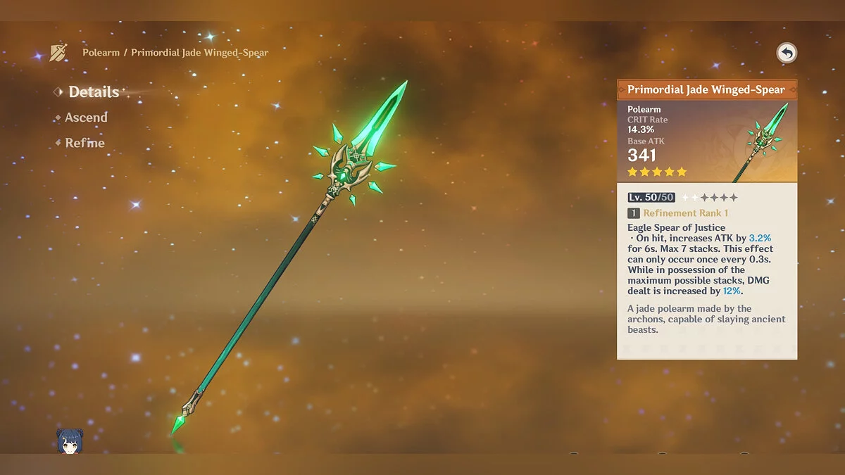 Лучшее оружие: «Нефритовый коршун» (Primordial Jade Winged-Spear). При попадании это оружие получает усиление силы атаки на 3,2% на шесть секунд. Эффект может складываться до семи раз, срабатывая каждые 0,3 секунды. Полностью прокачанное копьё даёт усиление урона на 24%.