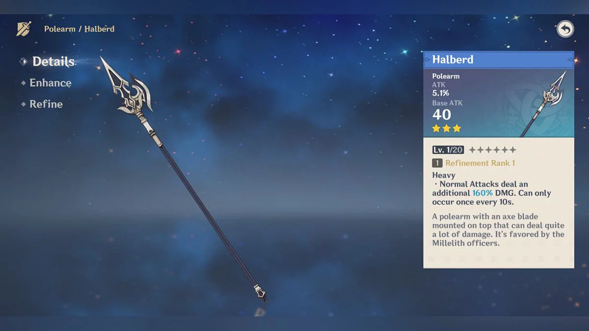 Альтернативное оружие: «Алебарда Миллелита» (Halberd). Это трёхзвёздное оружие — дешёвая замена увеличению урона Сяо. Одна атака каждые десять секунд нанесёт дополнительно 160% урона или 320% урона при полном повышении уровня копья. Длится всего одну атаку и не складывается.