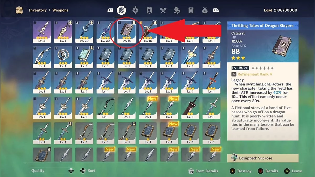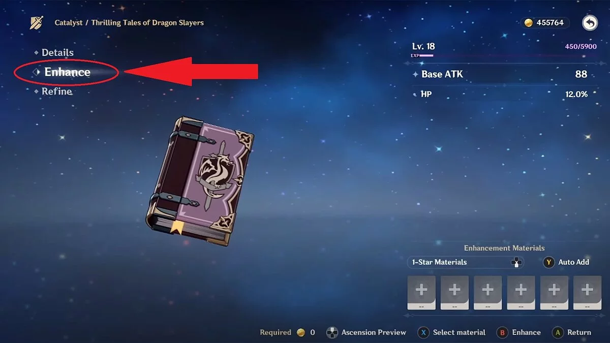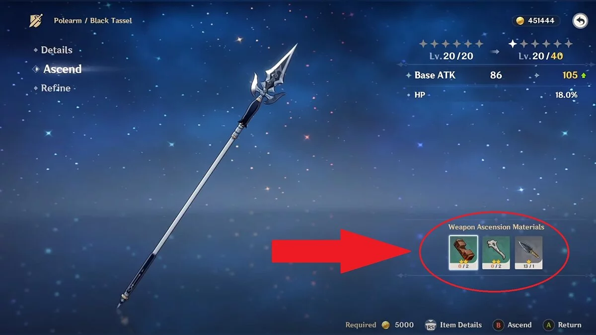 Помимо Ранга Приключений, для возвышения оружия вам потребуются особые ресурсы. У каждого меча, лука или копья они свои. На экране улучшения оружия, в правом нижнем углу, можно увидеть перечень и количество необходимых материалов.