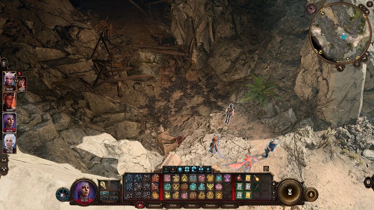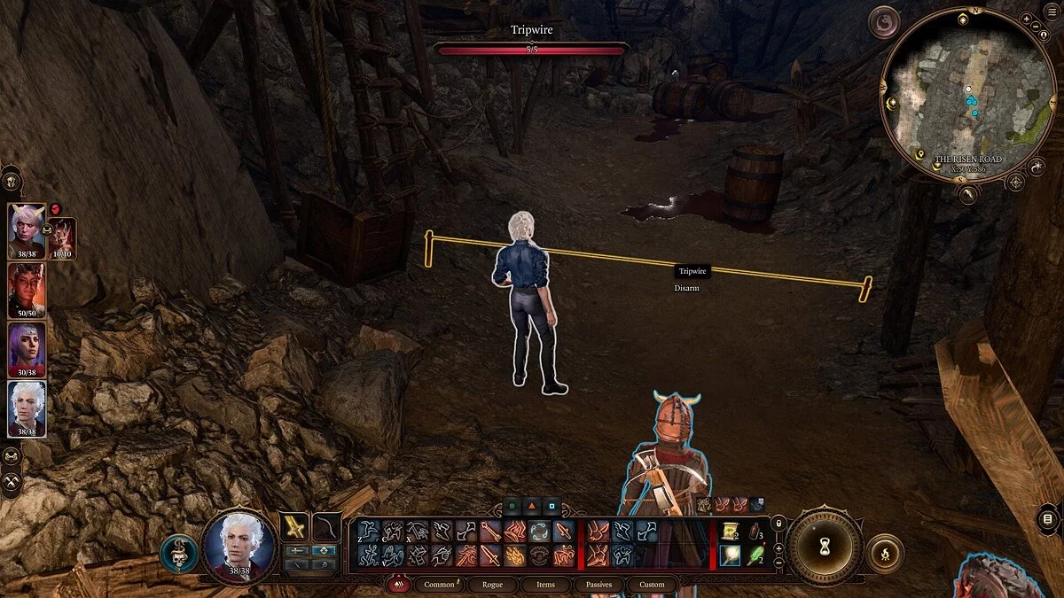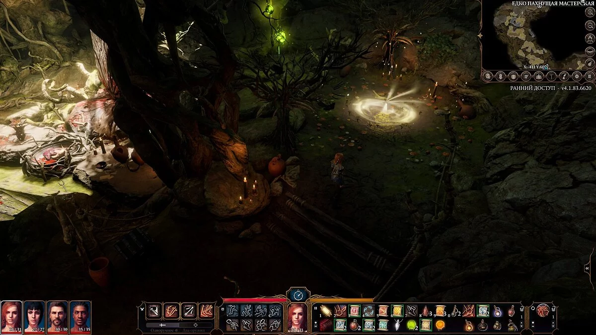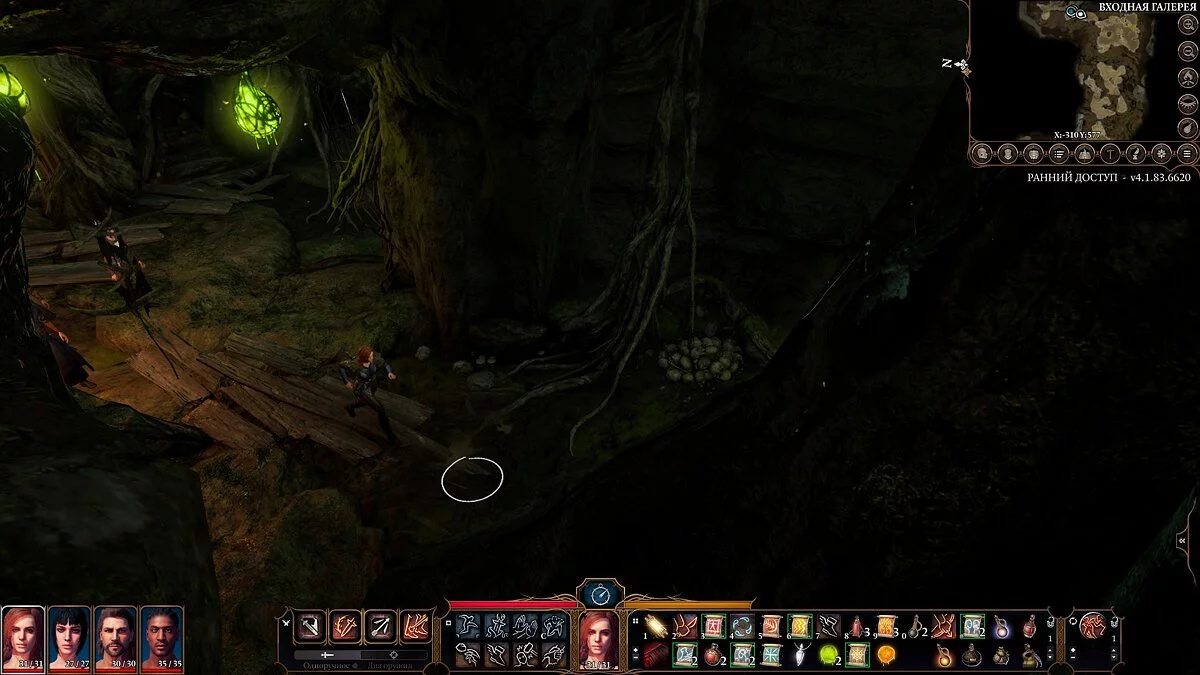 Местность патрулируют культисты. Постарайтесь не спровоцировать людей в масках (они порабощены и на самом деле не хотят причинять вред вашему персонажу). Обходите их осторожно. Чтобы упростить стелс-прохождение, разделите партию через кнопку «режим группы» и активируйте походовый режим. Проведите героев в правую часть пещеры, минуя конусы видимости культистов. Вы также можете использовать зелье невидимости или свитки с заклинаниями. Подойдя к краю водопада, выбирайте каждого героя по одиночке и перепрыгивайте через ущелье. Не убирайте режим скрытности.