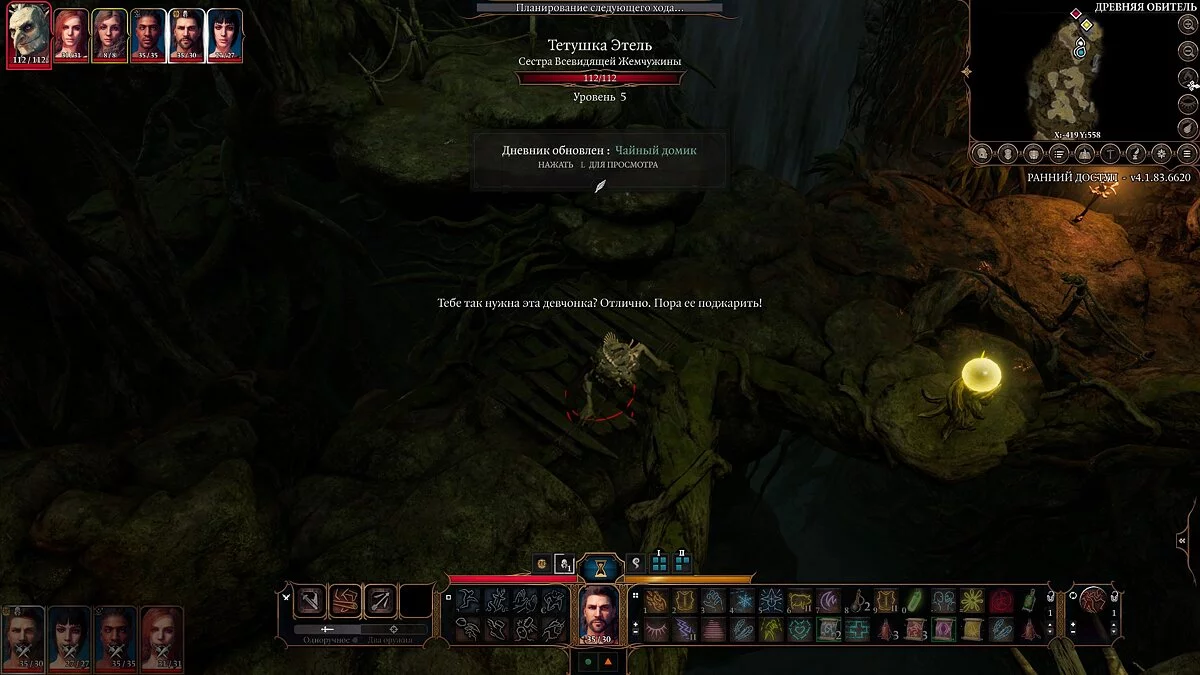 Предупреждаем заранее: тетушка — довольно сложный босс, поэтому не забывайте сохраняться при удачных бросках и атаках. Первым делом Этель подожжет клетку Майрины. Вы должны на своем первом ходу бросить бутылку с водой на клетку, тем самым потушив огонь. Старайтесь оглушать культистов и не убивать их.