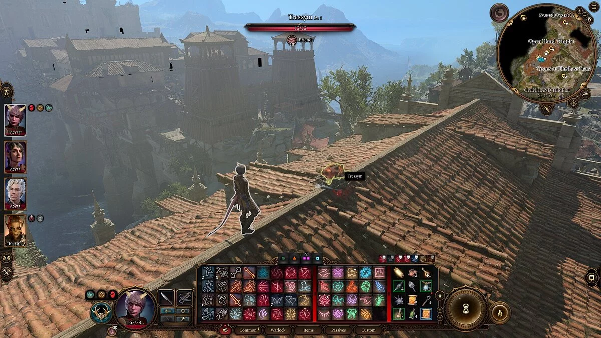 Отправляйтесь в Нижний город. Рядом с рунным камнем, у центральной стены есть башня. Взберитесь на нее. Достигнув вершины, идите на север до здания. Вас остановит группа восторженных охранников. Уговорите их пропустить вас. Астарион может помочь вам с этим. Следуйте по тропе, которая ведет к замку.