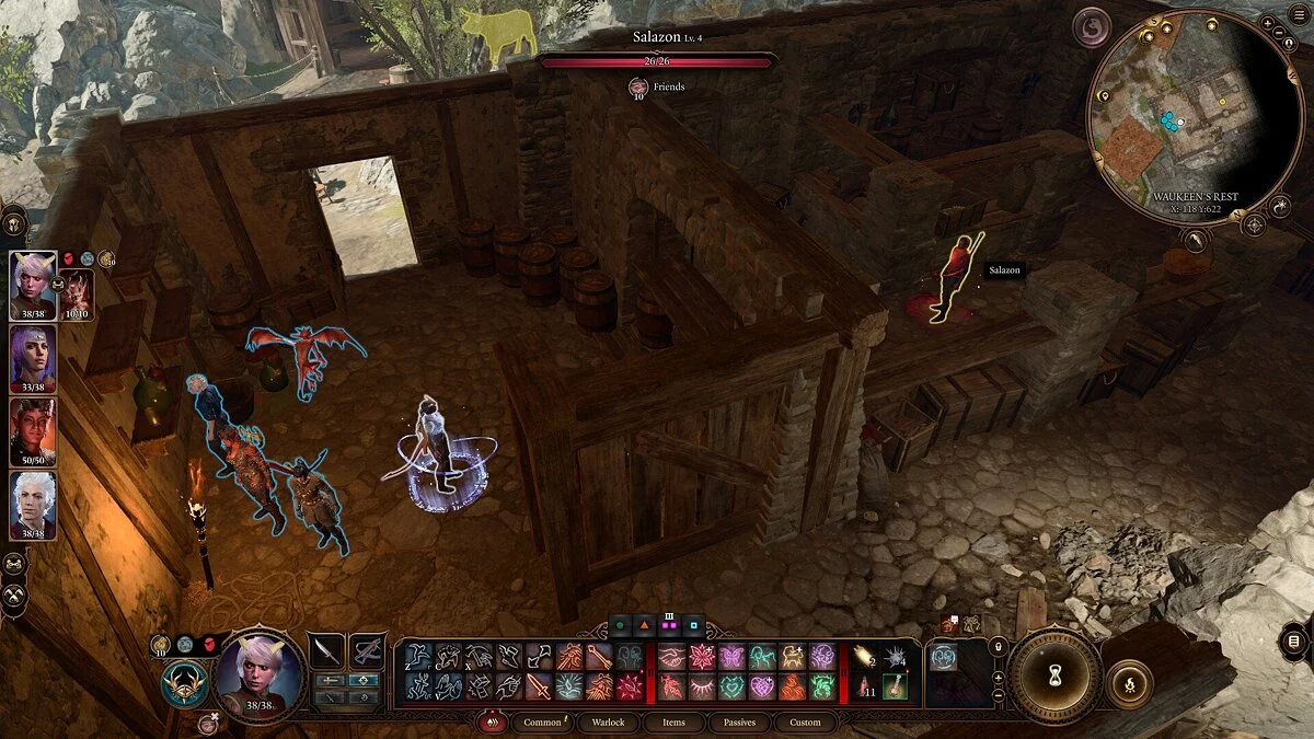 Первым делом освободите Астариона. Подойдите к нему и примените «Помощь». Отталкивающим ударом скиньте Кассадора в пропасть. Добейте остальных противников. После битвы Астарион откроет саркофаг и вытащит вампира. Убедите сопартийца убить Кассадора и отказаться от проведения ритуала. Предложите освобожденным пленным переместиться в городскую канализацию. В таком случае гурцы помогут в финальном сражении.
