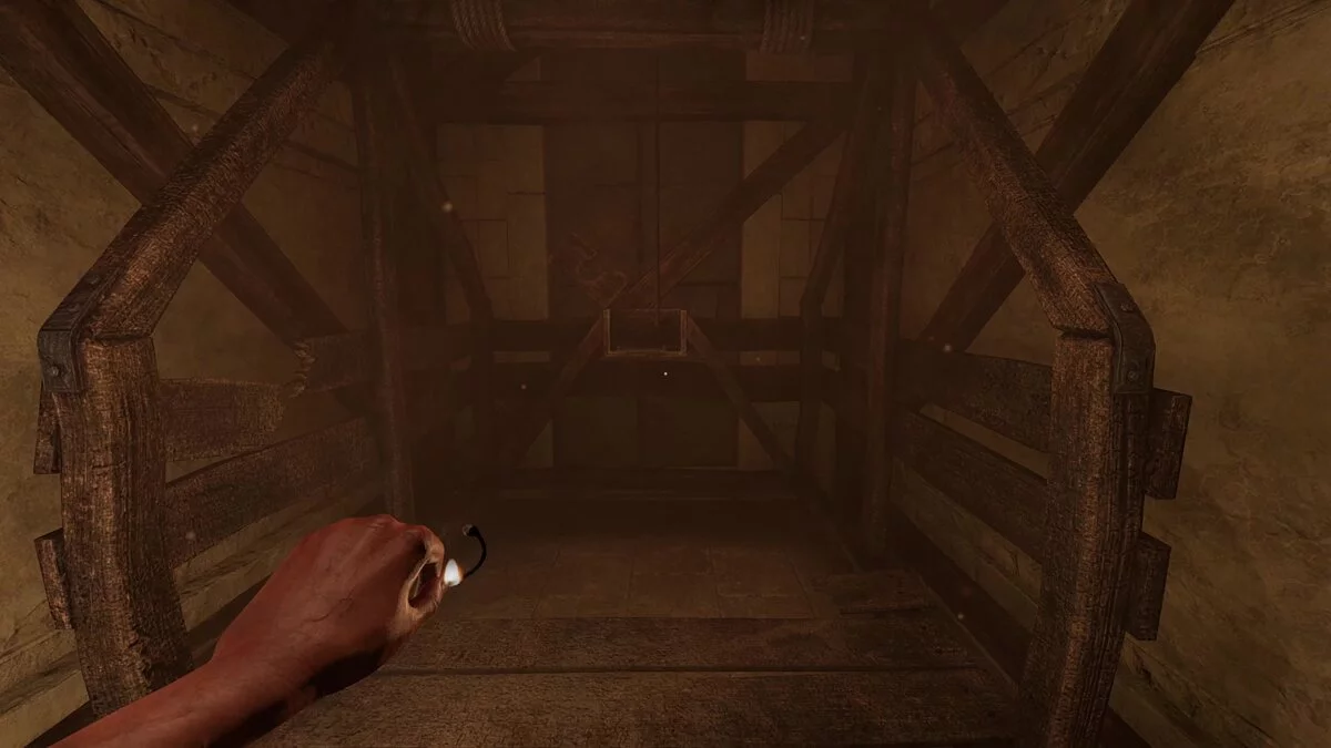 Теперь нужно починить пол. Найдите доску в том же коридоре или соседней комнате и положите ее так, чтобы на нее можно было встать. Можно крутить ручку и подниматься наверх.