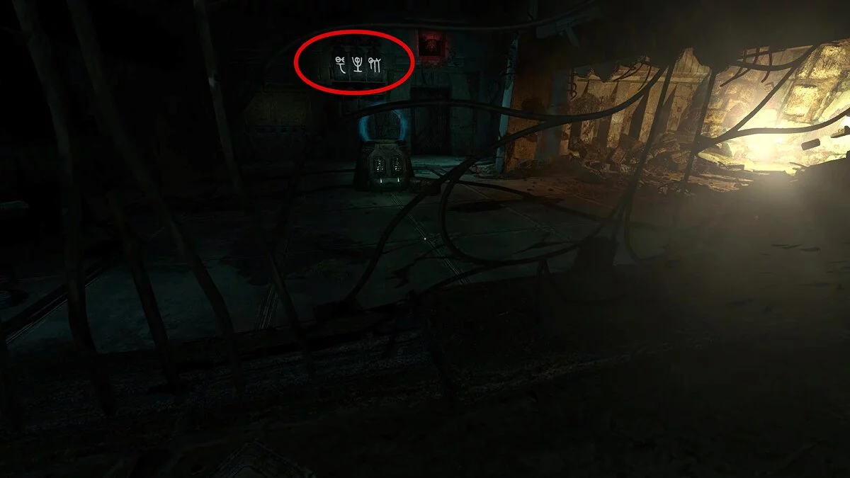 Вы попадете в зал с тремя колоннами, на которых изображены символы. Неподалеку будет расположена панель управления, похожая на ту, что мы видели ранее. Значков на ней теперь не хватает, поэтому придется как-то выкручиваться. Вы можете повернуть колонны (только две из них) и саму панель. Левая колонна не двигается, поэтому первый символ у нас уже есть. Если не хотите мучиться и подбирать комбинацию самостоятельно, то правильный ответ — на скриншоте.