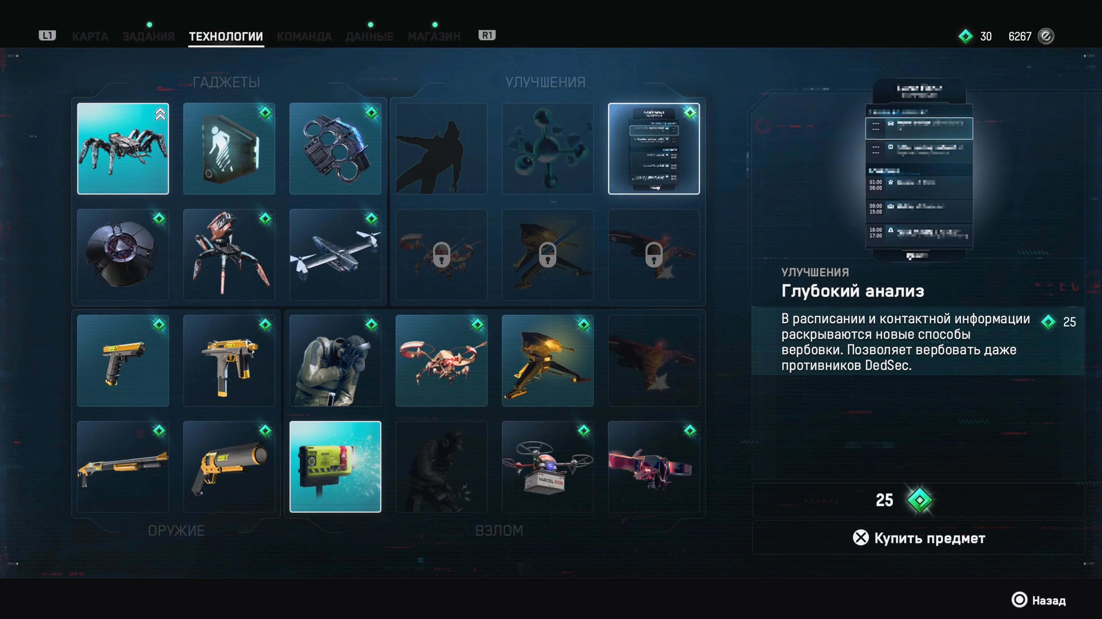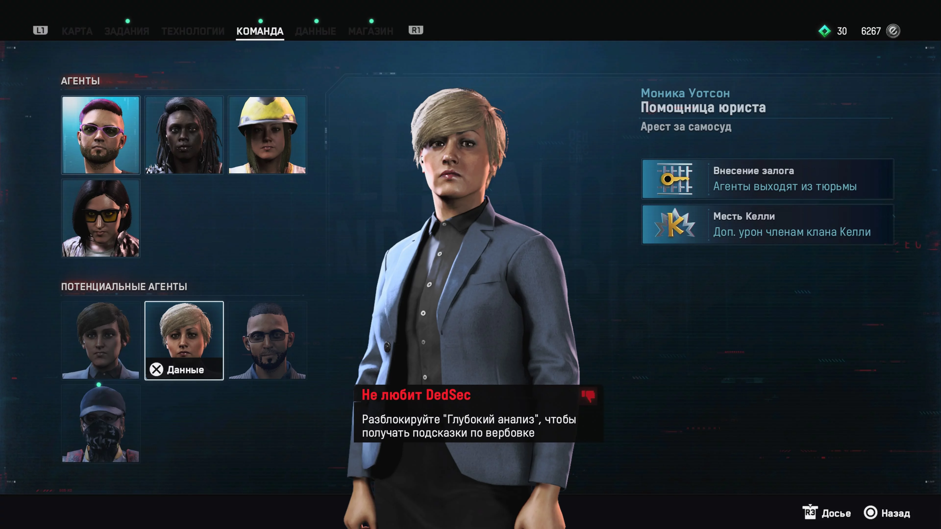 Улучшение «Глубокий анализ» позволит проще вербовать агентов, особенно полезно для получения в команду противников DedSec. Такой навык стоит взять всем персонажам.