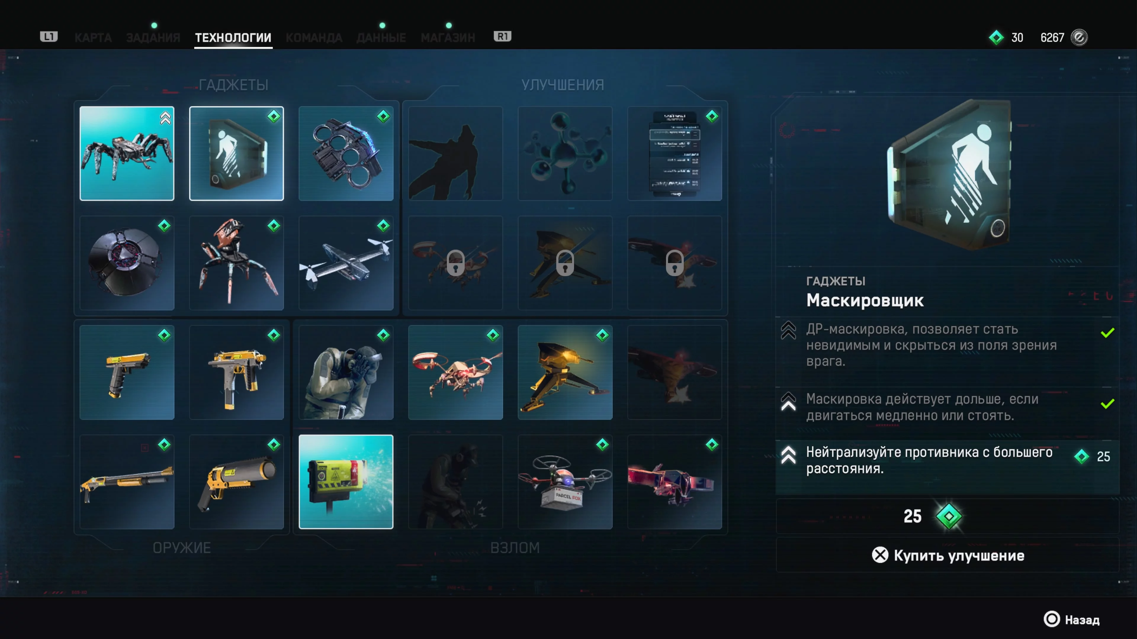 Бот-паук станет вашим основным средством взлома и прохождения. В большинстве заданий вашему персонажу можно будет даже не заходить в здание. Просто рассмотрите территорию по камерам и проведите паука по безопасному пути. Паук совсем не беспомощен, он может нейтрализовать охранника, если подберется сзади. Прокаченный паук умеет бегать, прыгать два раза и использовать невидимость.