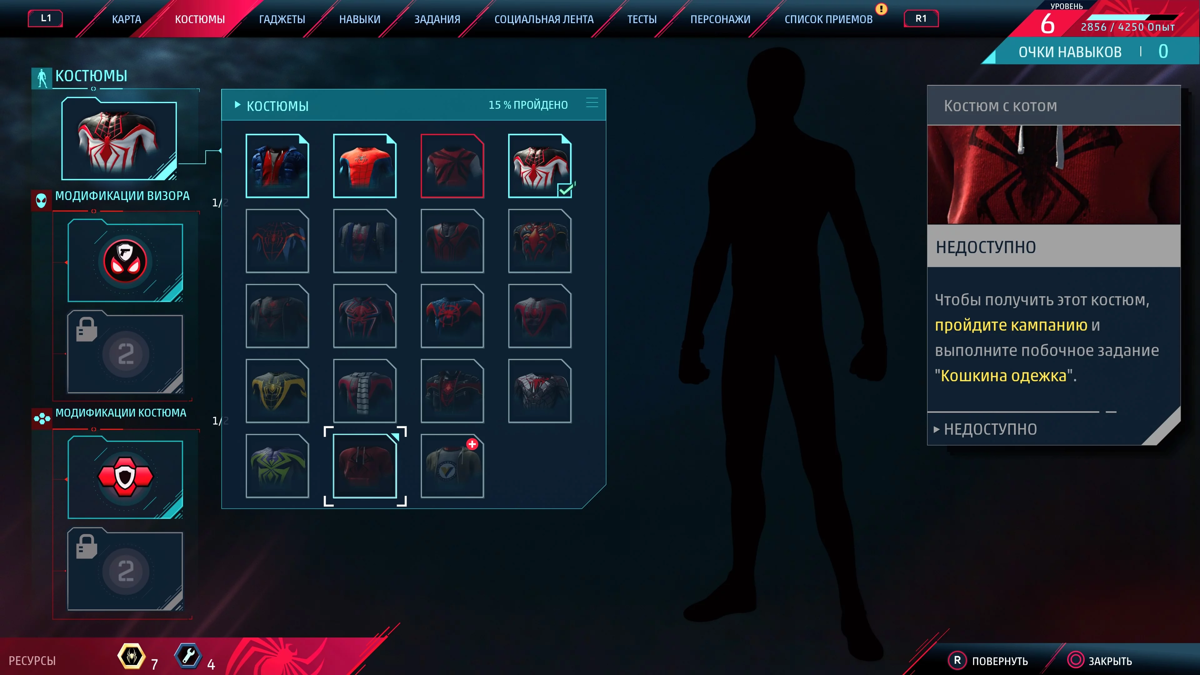 Но завершение этой миссии не позволит сразу же использовать костюм. Вернув Человека-паука (кота) хозяину, вы откроете вкладку костюмов в своем меню и увидите два требования для его разблокировки: завершите побочное задание «Кошкина одежка» и пройдите кампанию.