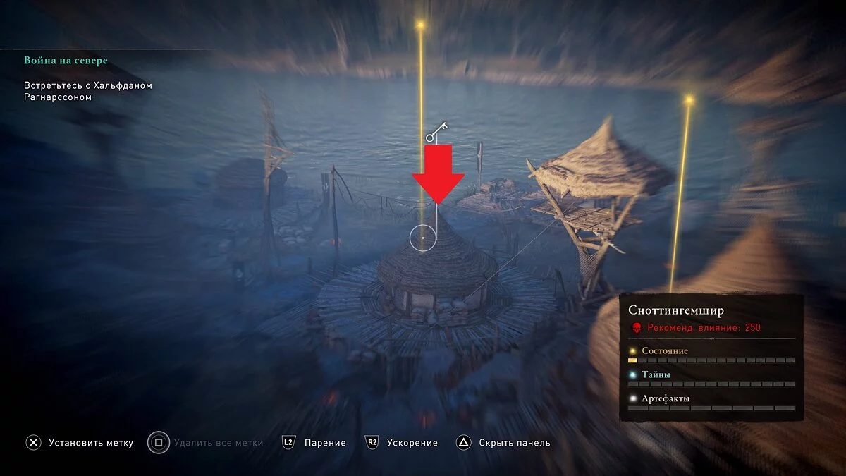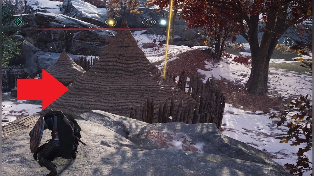Найдя большой лагерь врагов, используйте ворона и обратите внимание на небольшую хижину: