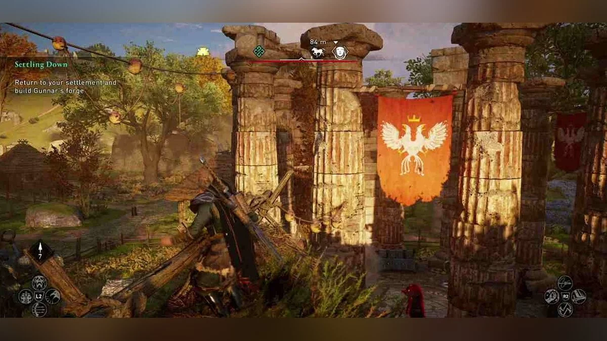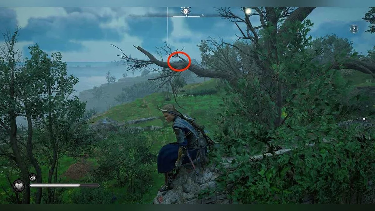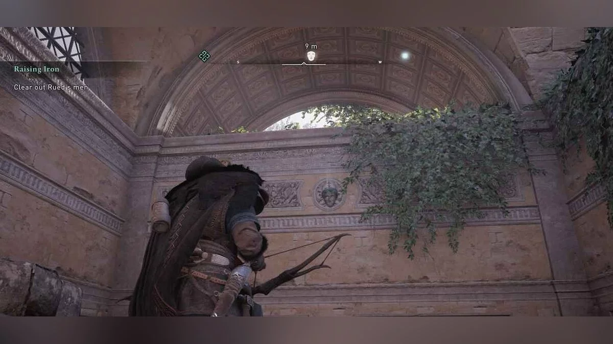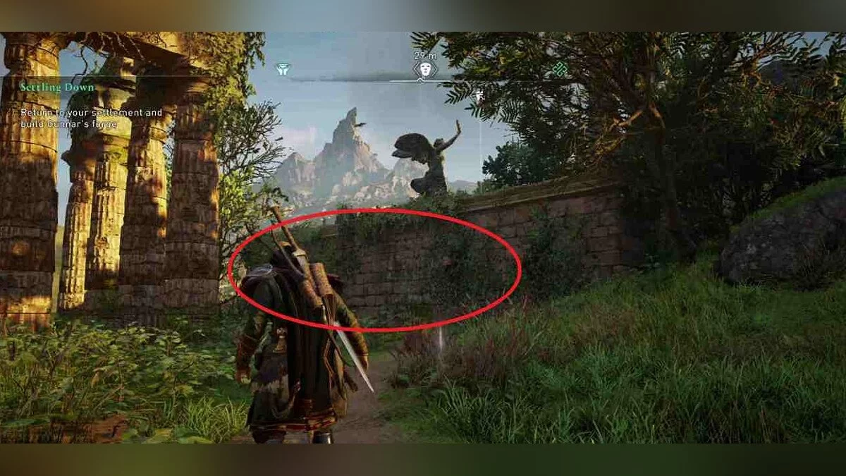 Возле римских руин есть дерево, которое указано на скриншоте. Заберитесь на него. Артефакт лежит в гнезде.
