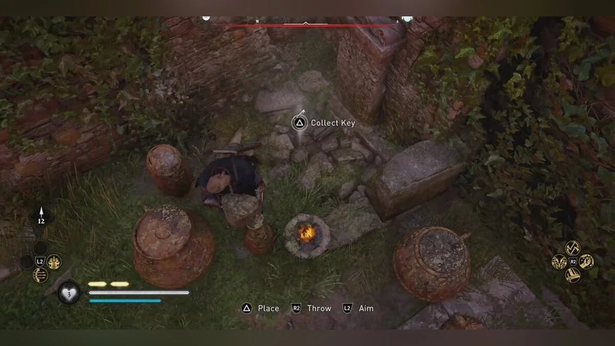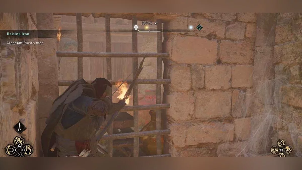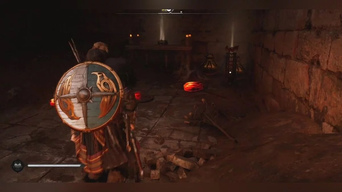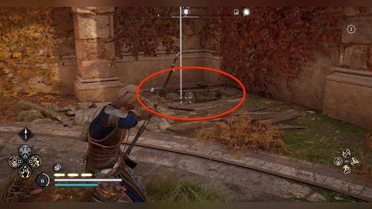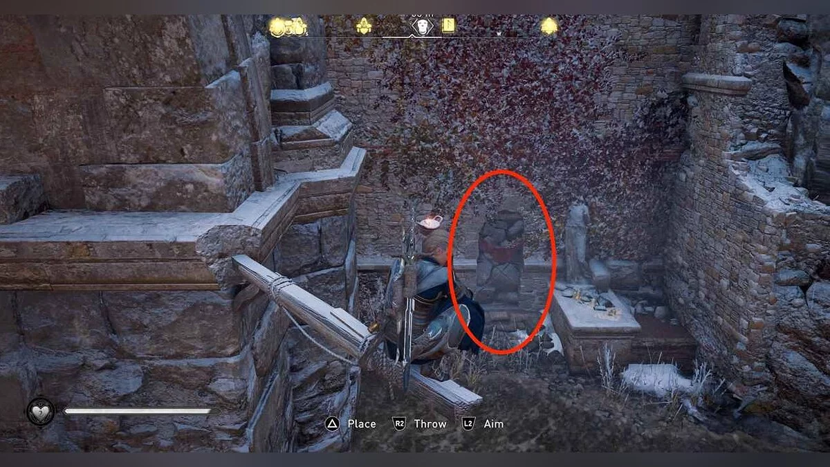 Заберитесь на самый верх руин и выстрелите зажигательной стрелой по веревке, которая удерживает груз. Он пробьет хрупкий пол. Спускайтесь и забирайте артефакт.