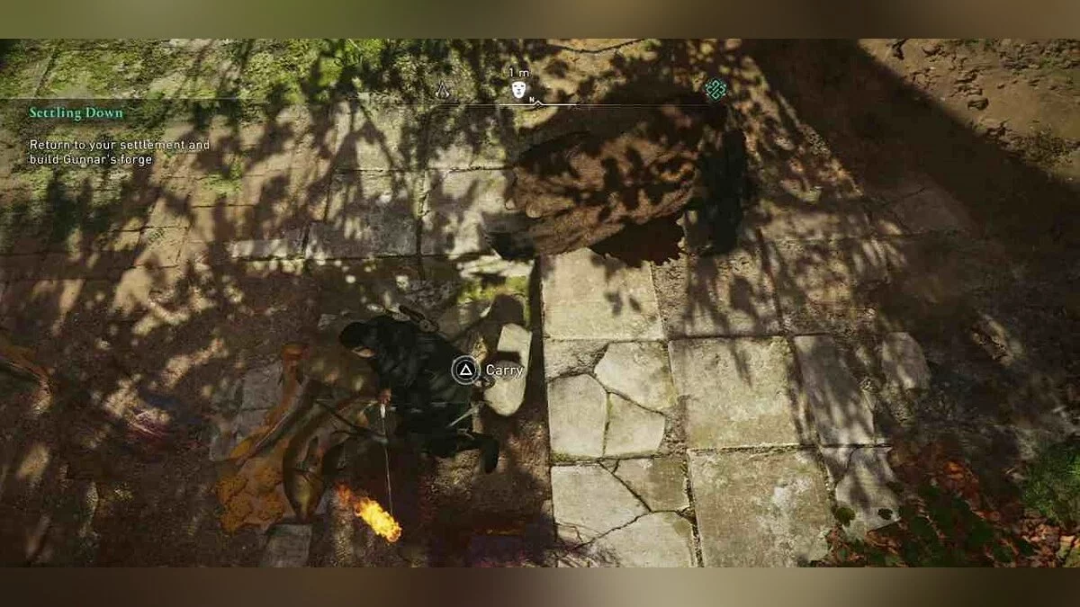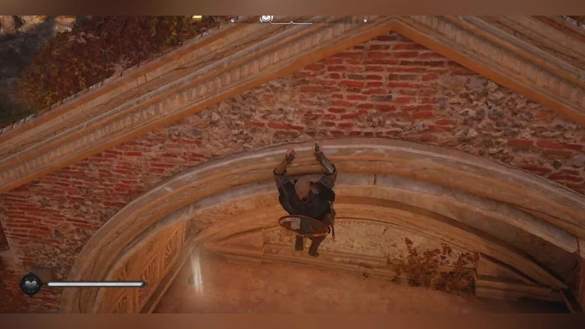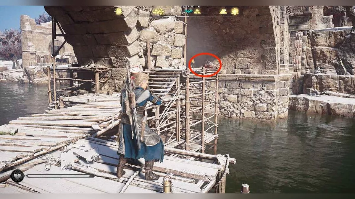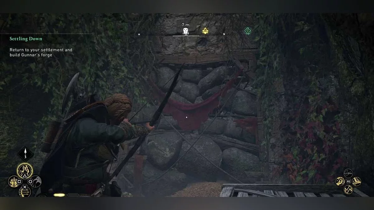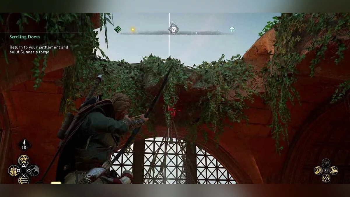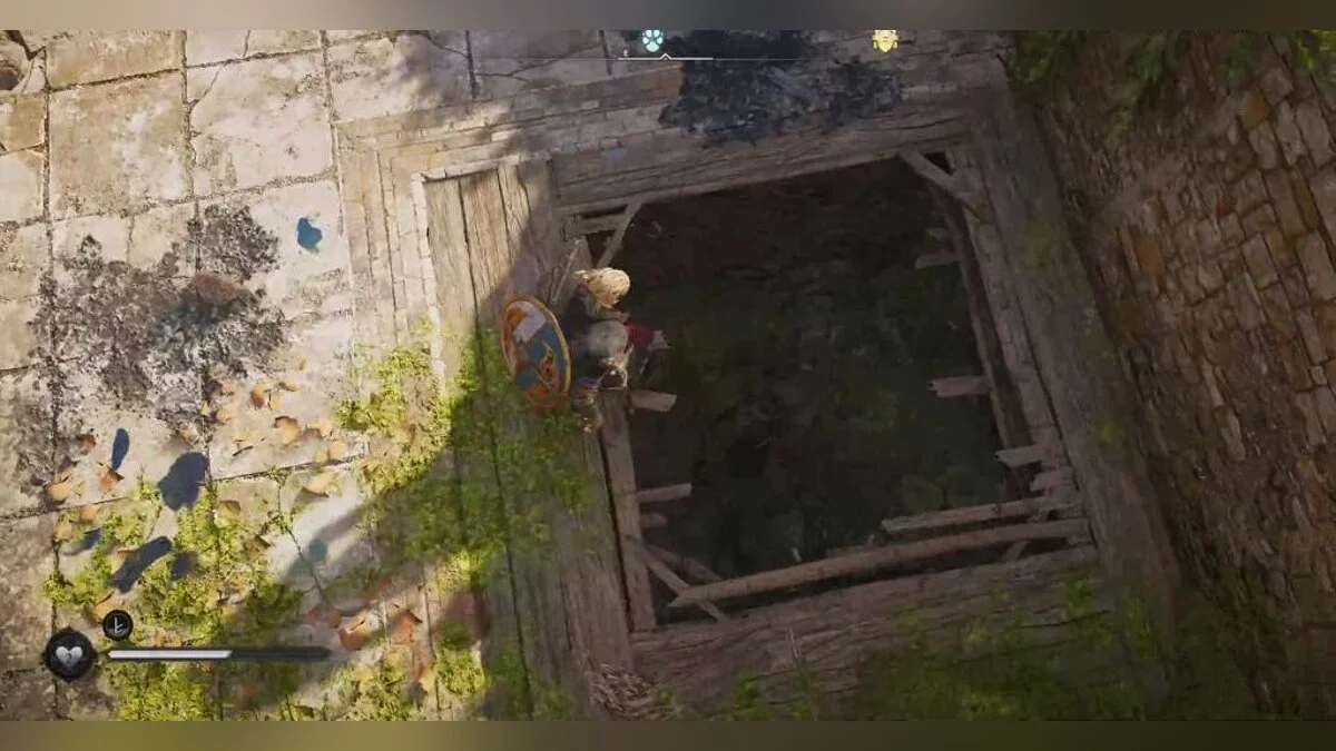 Заберитесь на самый верх руин и выстрелите зажигательной стрелой по веревке, которая удерживает груз. Он пробьет хрупкий пол. Спускайтесь и забирайте артефакт.