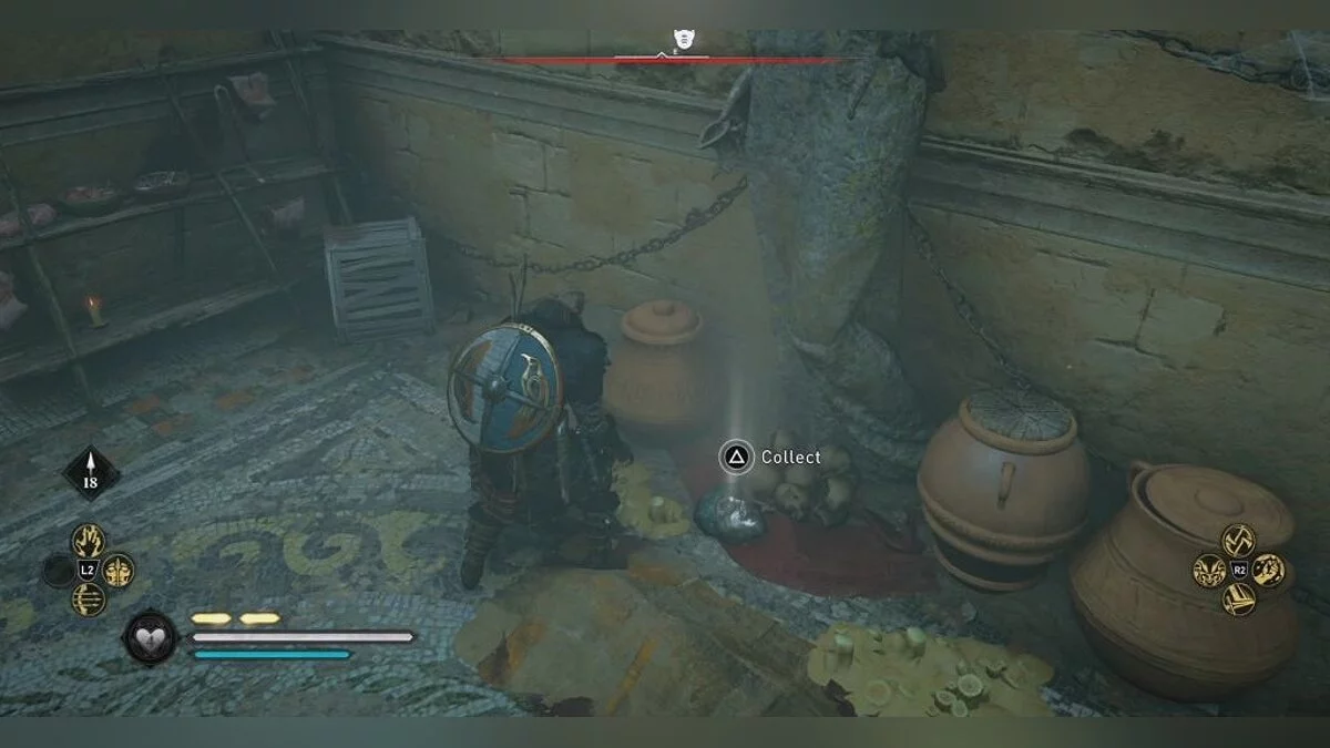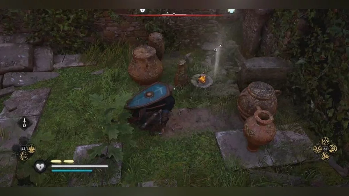 Доберитесь до точки, которая указана на карте. Перебейте вражеских солдат и возьмите кувшин с маслом. Взорвите с его помощью хрупкий пол и спускайтесь вниз. Стреляйте по другому кувшину через решетку, проходите вперед и забирайте артефакт.