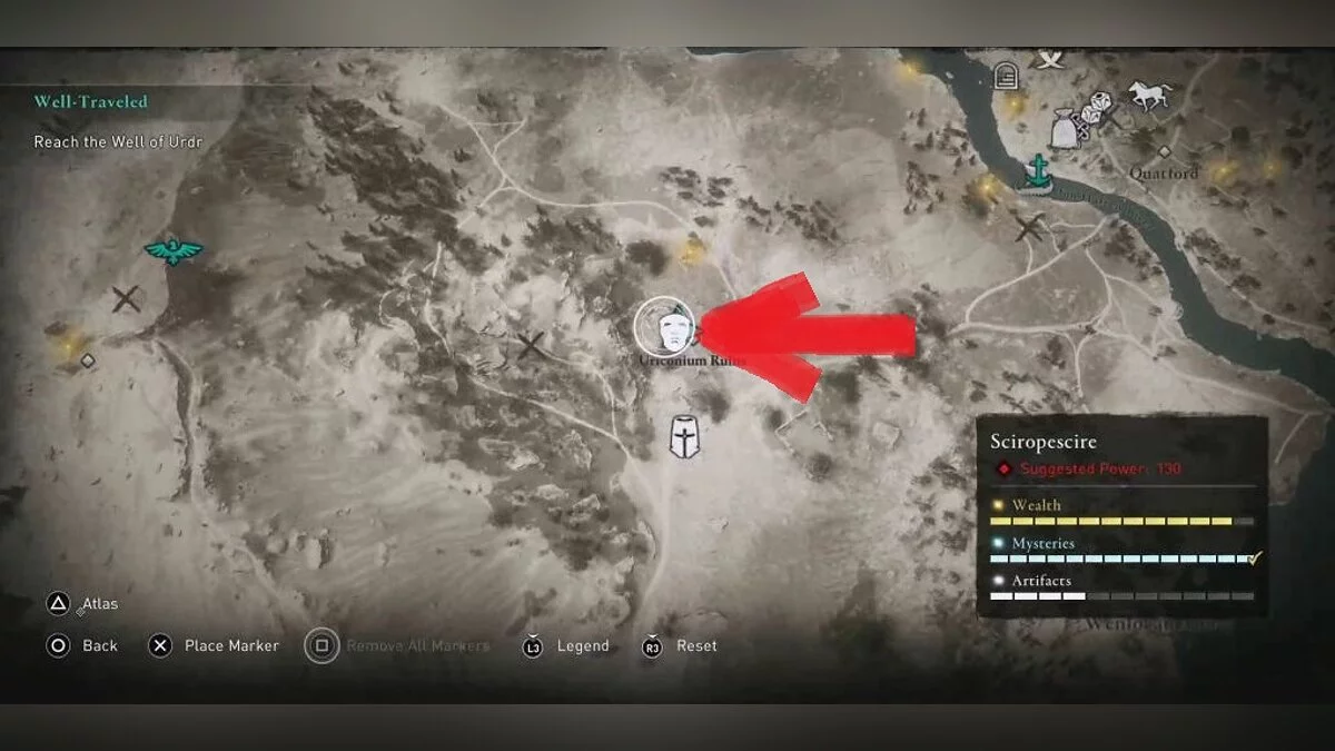 Среди руин, которые обозначены на карте, есть колонна. Чтобы забраться на нее, вам потребуется придвинуть к ней камень. Артефакт находится на самом верху.