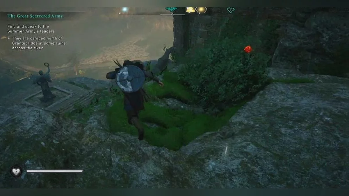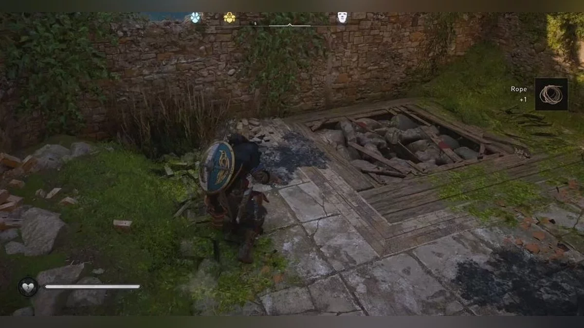 Доберитесь до указанной точки. Заберитесь в стог стена, а затем вниз по веревке. Вам нужно примерно на середине пути спрыгнуть, чтобы попасть на платформу, где лежит артефакт.