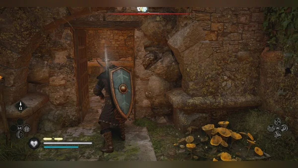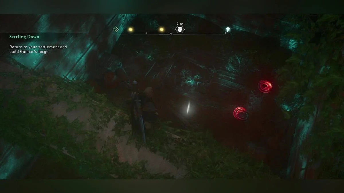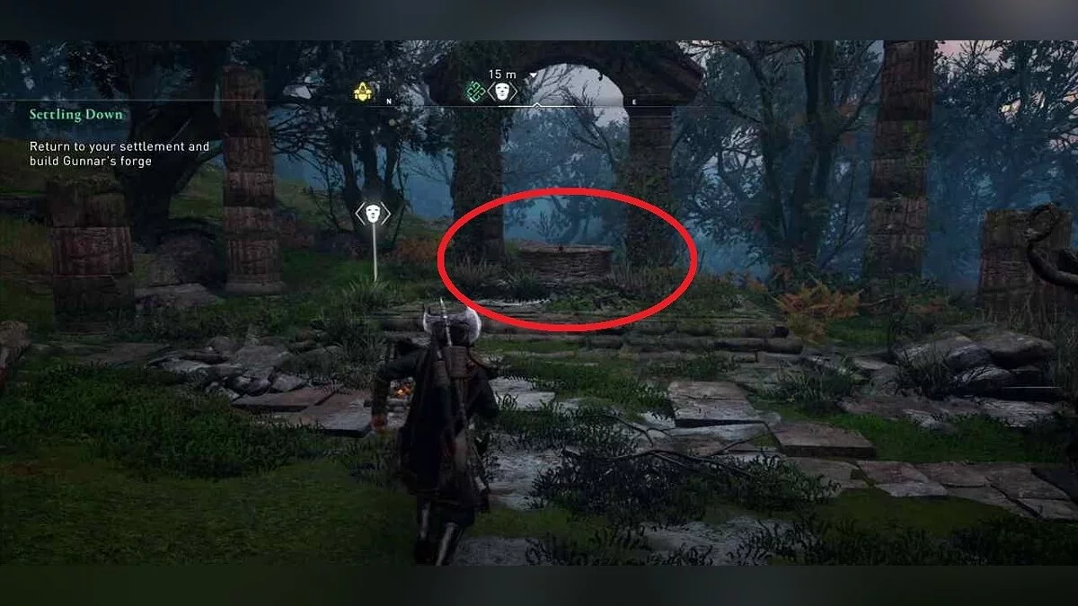 Доберитесь до руин, которые указаны на карте. Вам нужна дверь, которая расположена на севере развалин. Открыть ее можно только ключом, который лежит в углу внутреннего двора. Для поиска используйте взгляд Одина. Отодвиньте камень, который преграждает вам путь и заберите ключ. Затем открывайте дверь и берите артефакт.