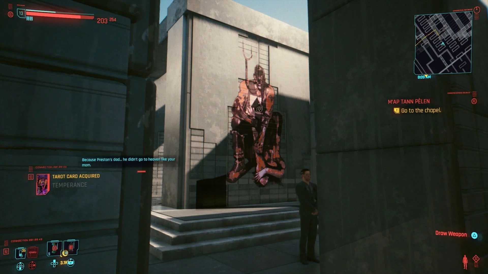 Первую карту таро можно найти на внешней стене рядом с вашей квартирой. Сразу поверните налево, когда выйдете из квартиры, и вы увидите ее рядом с собой. На фреске изображены мужчина и собака. Взаимодействуйте с ним, чтобы получить карту.