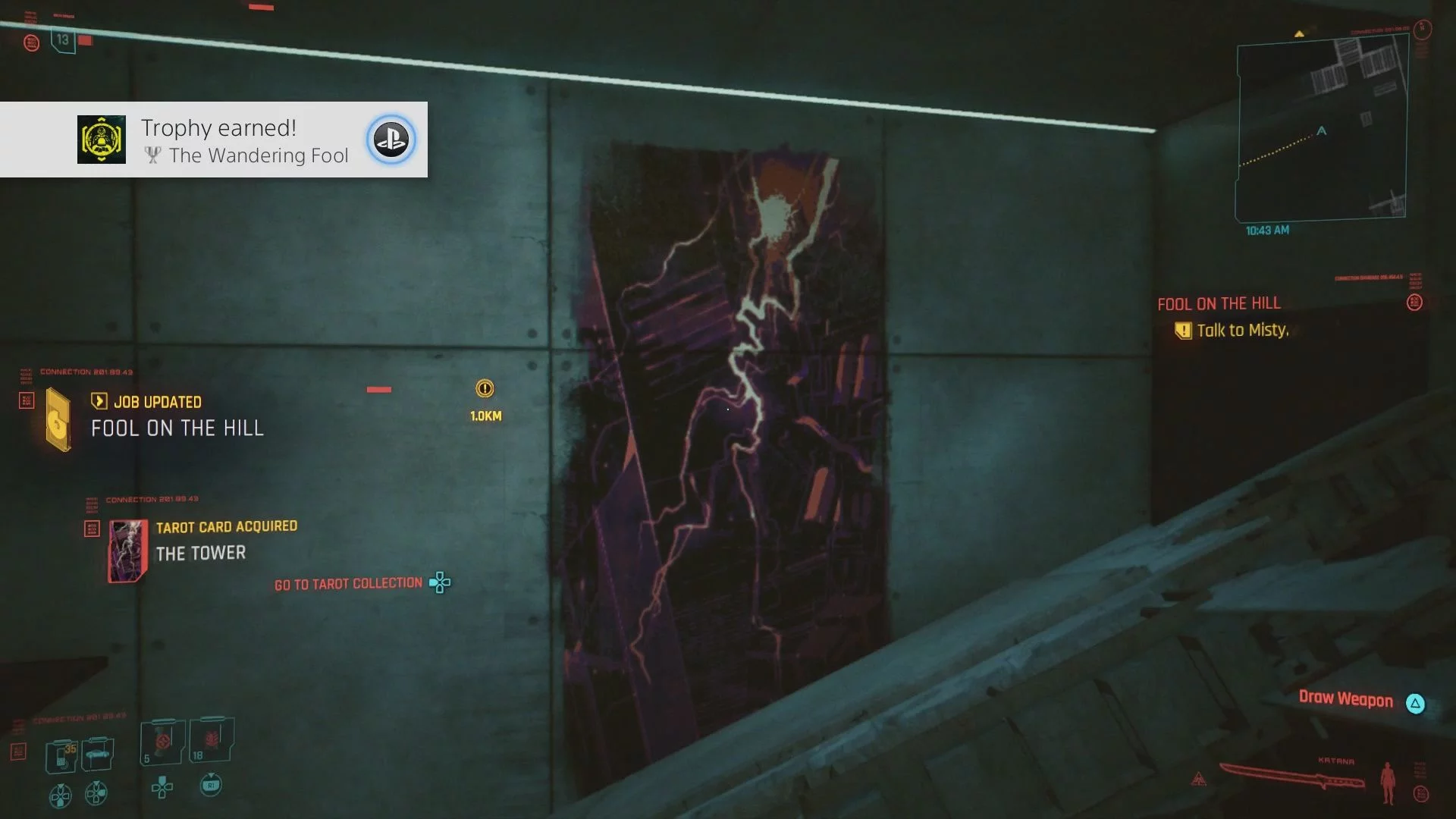 Во время выполнения задания «Шут из Найт-Сити» в Cyberpunk 2077 придется найти 20 граффити с картами таро. Придется отсканировать все изображения на стенах, чтобы завершить задание. Также вы получите трофей (достижение) «Бродячий шут» (The Wandering Fool).