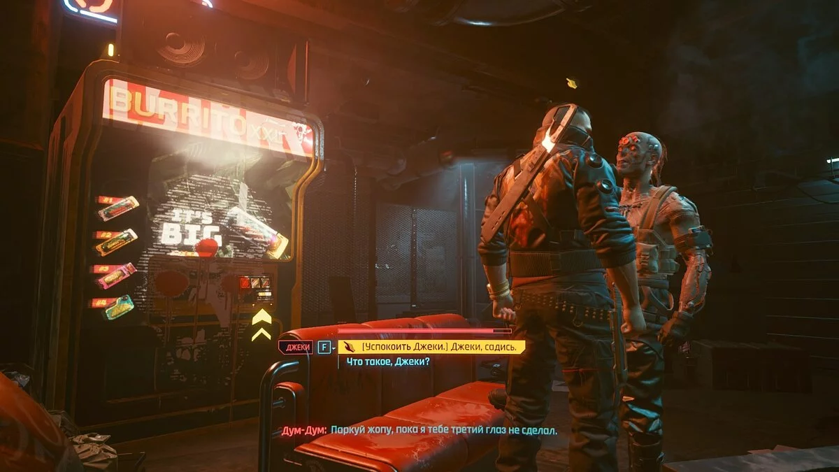 Итак, когда окажетесь на диване, Джекки не захочет подчиниться. Чтобы уговорить его, выберите [Успокоить Джеки]. Далее киборг предложит вам затянуться ингалятором. Если вы идете по пути «Дитя улиц», то можете выбрать пункт с описанием наркотика. В любом случае мы советуем принять его предложение, поскольку никаких негативных эффектов ингалятор не даст.