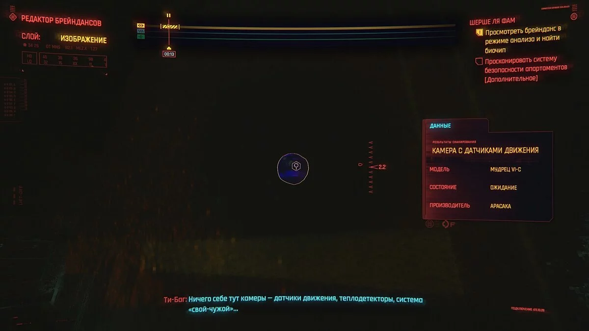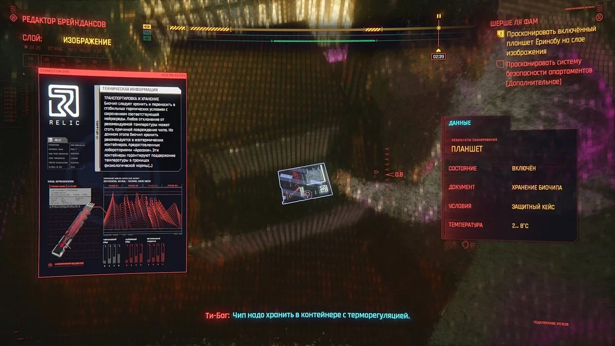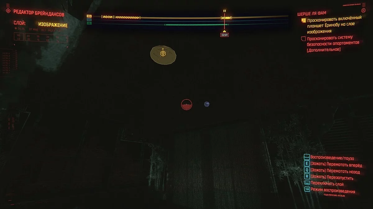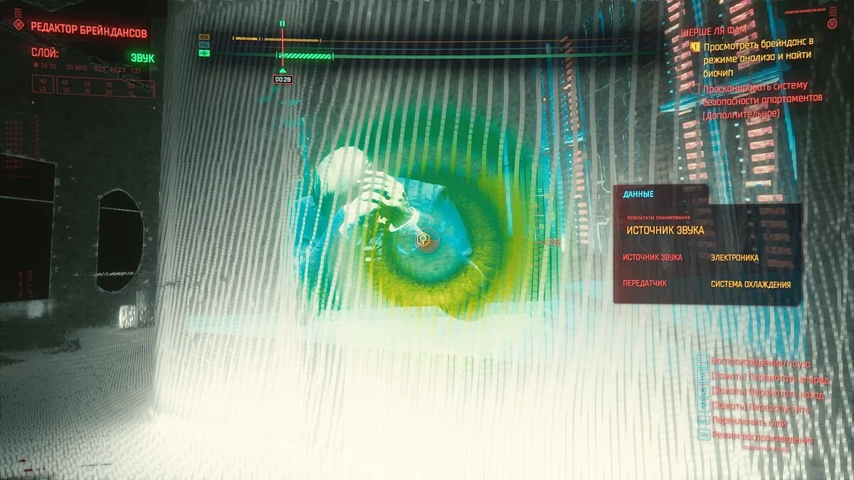 Сперва пройдите обучающее подключение к воспоминаниям. Здесь вам расскажут про основные механики брейнданса. Пропустить обучение нельзя, поэтому вам придется следовать указаниям Джуди. В финальном подключении вам нужно исследовать следующие объекты (в скобках будут записаны временные отрезки, в которых можно найти те или иные улики):
