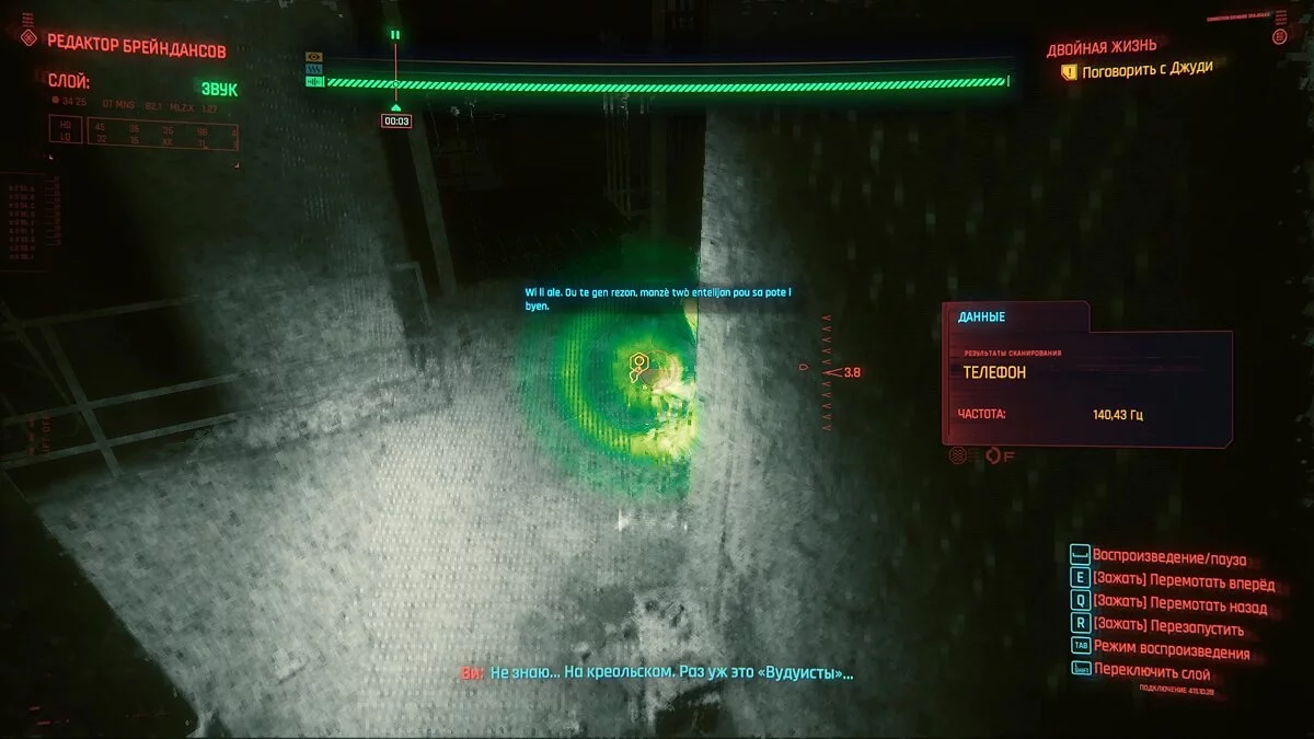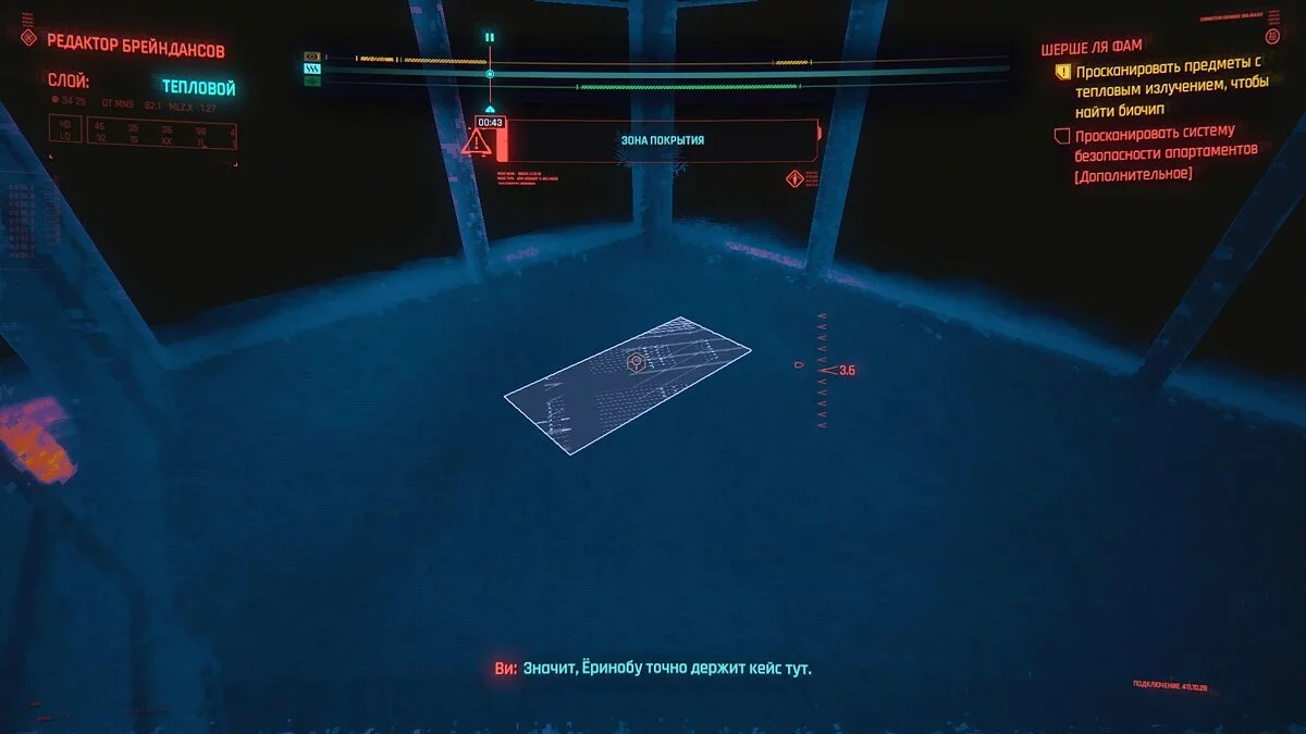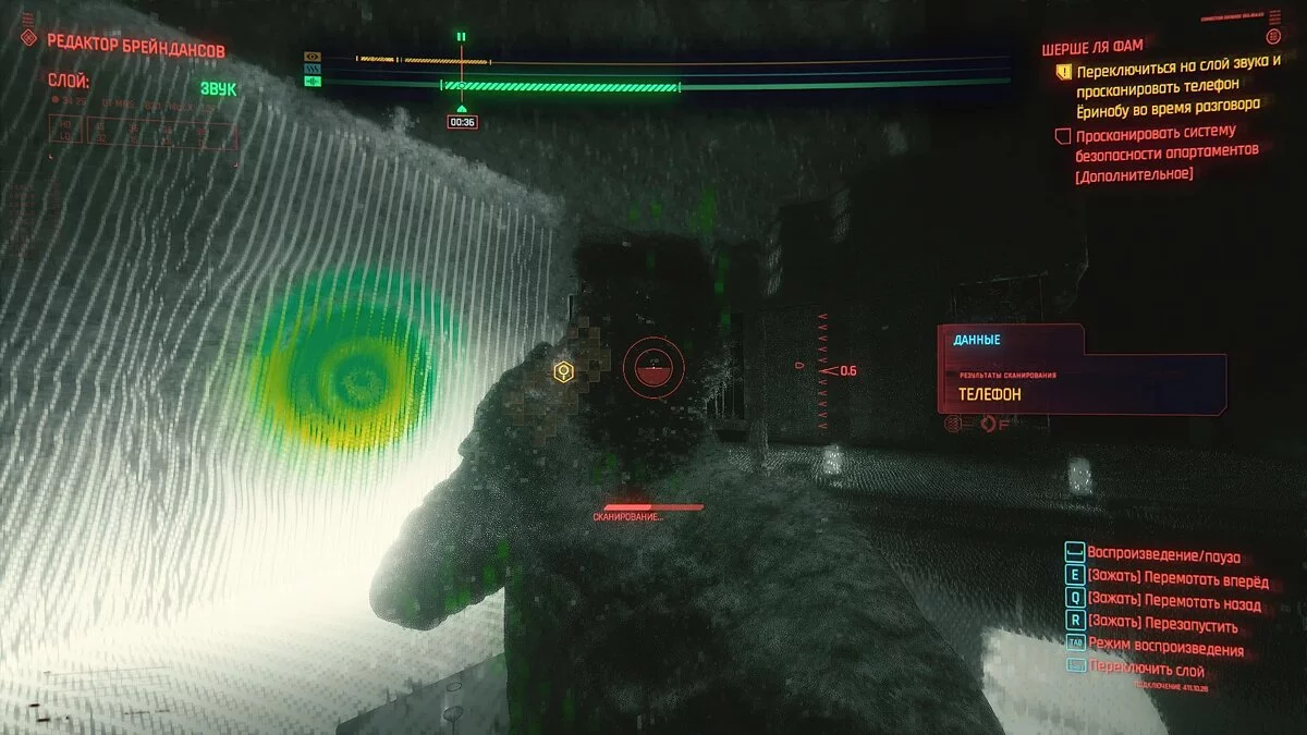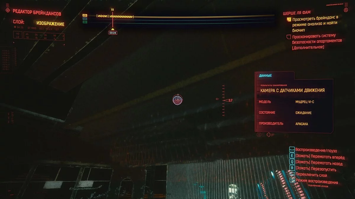 Сперва пройдите обучающее подключение к воспоминаниям. Здесь вам расскажут про основные механики брейнданса. Пропустить обучение нельзя, поэтому вам придется следовать указаниям Джуди. В финальном подключении вам нужно исследовать следующие объекты (в скобках будут записаны временные отрезки, в которых можно найти те или иные улики):