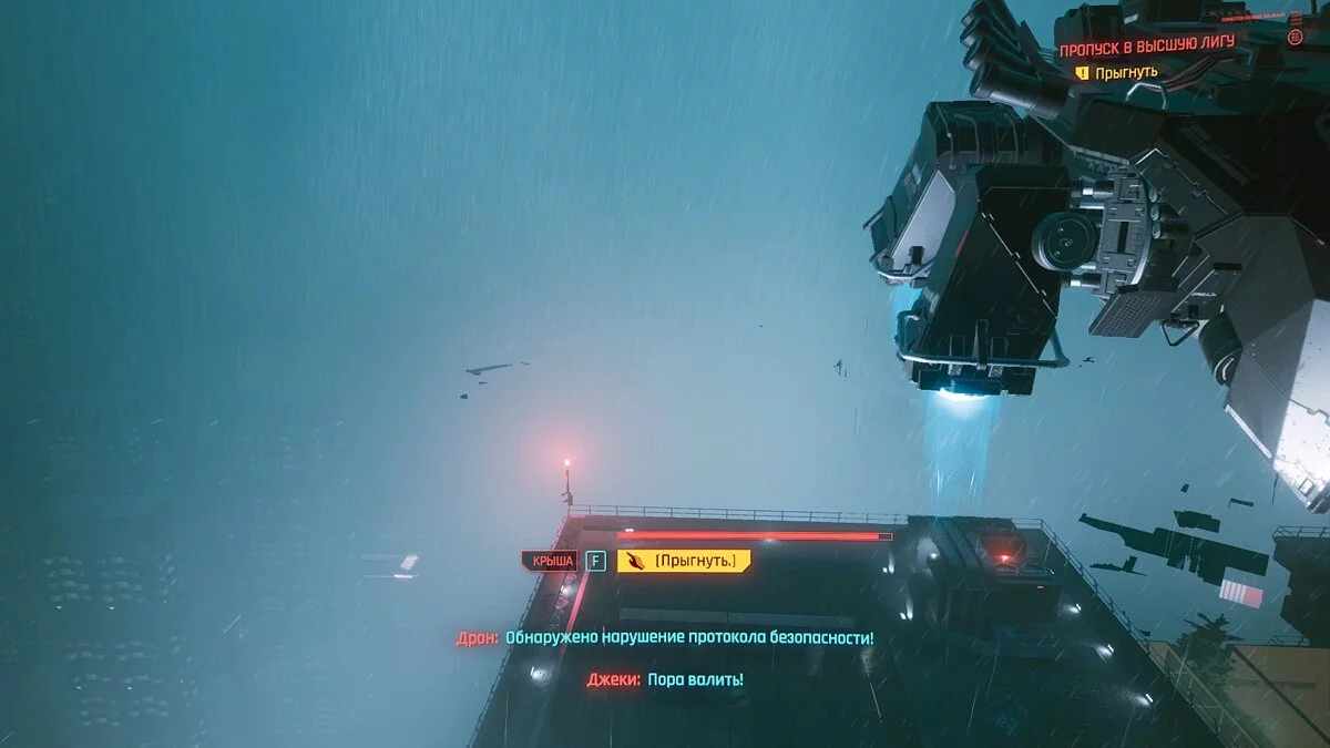 Покиньте платформу и пройдите под стенкой справа. На лифте поднимитесь на балкон 21 этажа. Следуйте по балкону вправо до упора и поднимитесь по еще одной металлической лестнице. Вы окажетесь у непрочного моста, часть которого обвалится прямо перед вами. Возьмите разгон и прыгайте вперед, затем спускайтесь вниз не привлекая внимания дронов (их здесь будет около четырех).