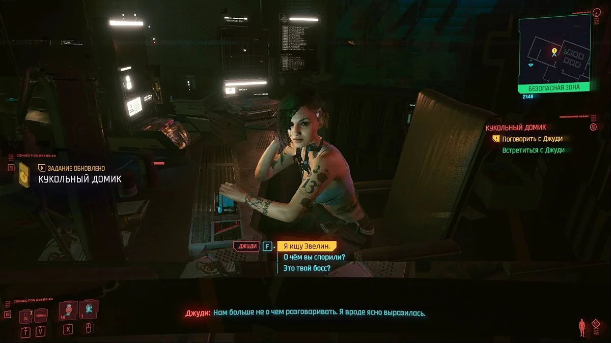 Задание обновится, когда вы окажетесь в квартире Джуди. Можете попытаться поговорить с Эвелин, но ничего не получится. Побеседуйте с подругой в соседней комнате (если расскажете ей про Джонни и биочип, ничего не изменится). Она снова предложит просмотреть несколько воспоминаний Эвелин. На первой записи вы можете найти: