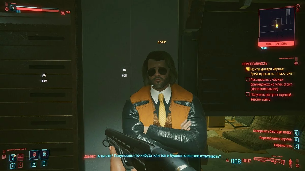 Скажите продавцу, что вам нужен какой-нибудь особенный брейн. Ничего такого у мужчины не окажется, но он даст еще одну наводку. Следуйте за маркером на карте и поговорите с мужчиной в черной куртке и галстуке. К слову, можете даже не тратить деньги на приобретение брейнданса (достаточно просто пустить пулю в лоб дилеру и забрать то, что нужно). В ином случае придется отвалить за запись 1000 евробаксов.