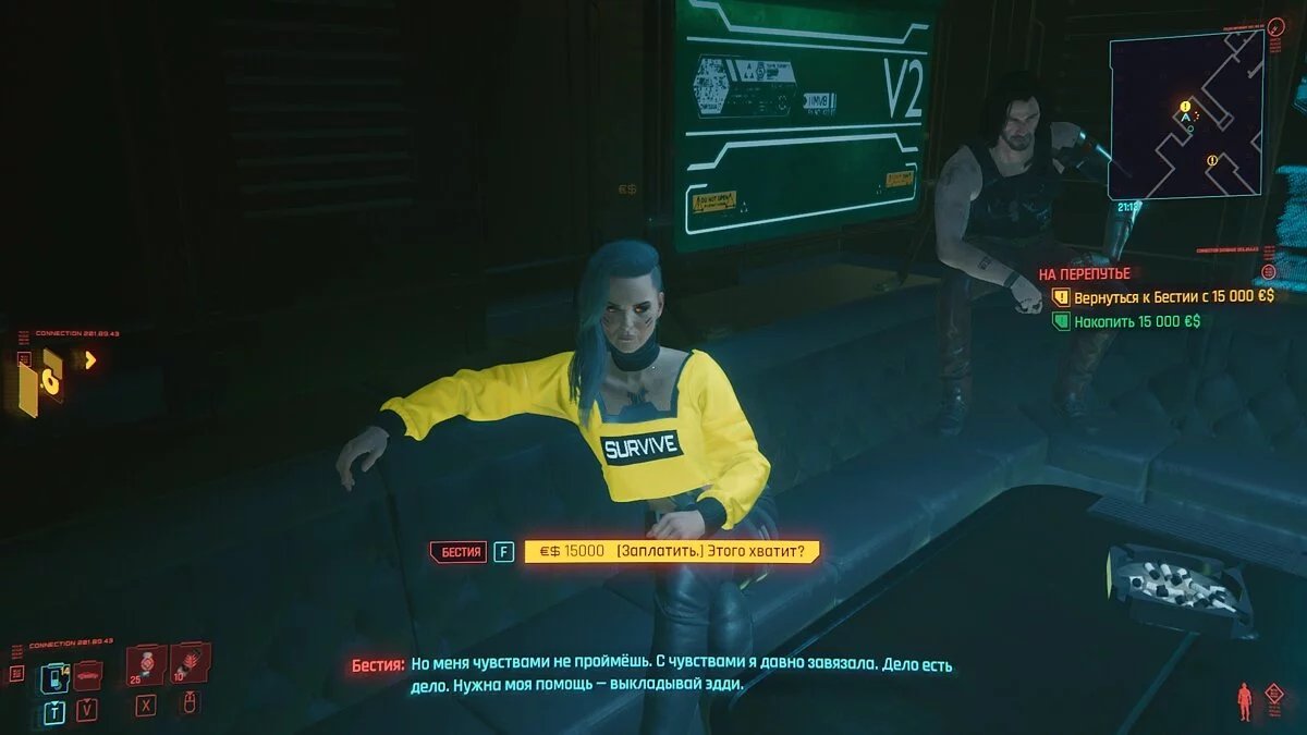 Отыщите бар «Посмертие» и поговорите с Бестией. Она любезно согласится помочь вам взамен на некоторые услуги. Чтобы продолжить это задание, необходимо собрать 15 000 евробаксов и отдать их девушке. Когда сделаете это, присядьте за барную стойку и подождите следующего дня. Бестия даст вам контакт другой интересной особы, которая нуждается в помощи.