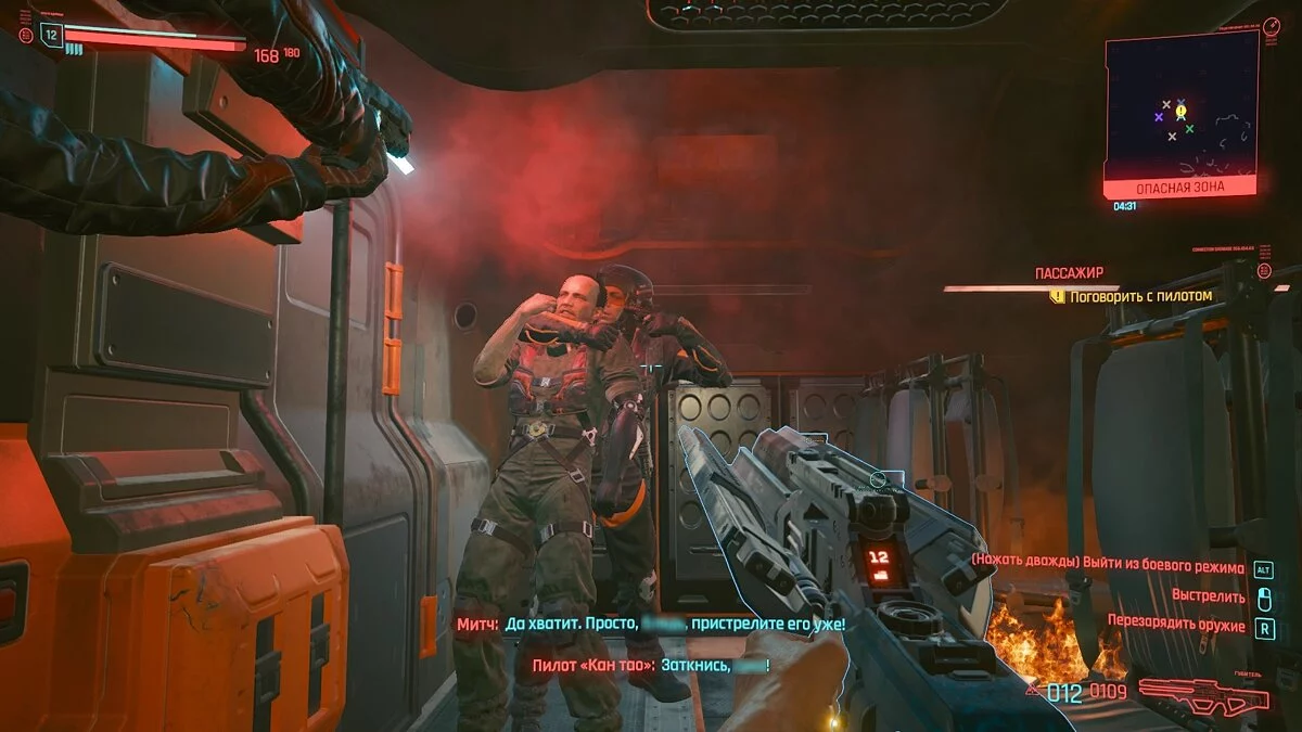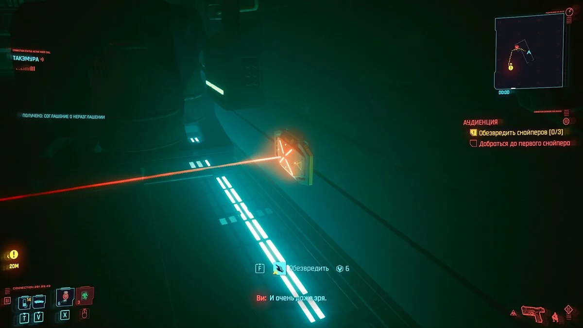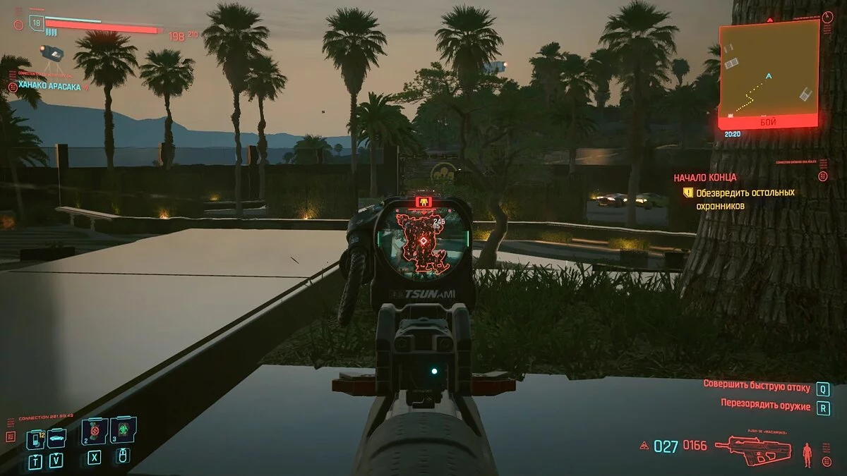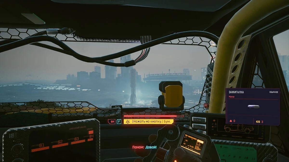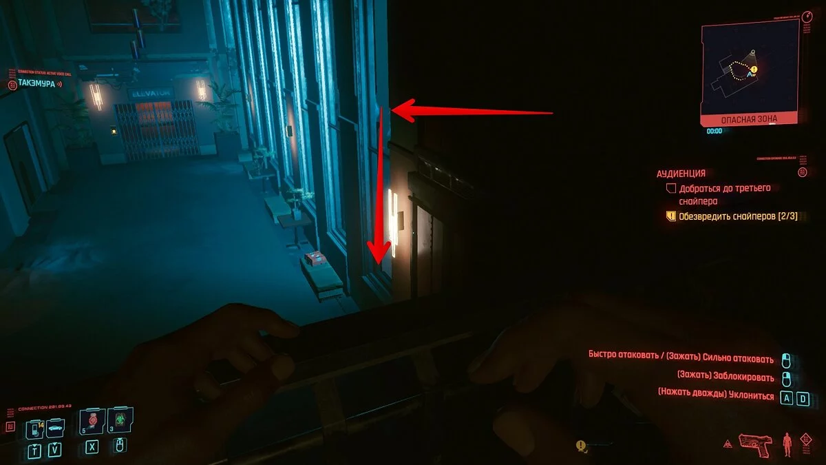 Когда окажетесь в автомобиле вместе с Джеки, то познакомитесь с искусственным интеллектом по имени Деламейн. С этим персонажем будут связаны некоторые побочные задания. Прибыв в гостиницу, подождите, пока Джеки пройдет через охранную рамку. В этот момент администратор спросит, зачем вы принесли в отель военную технику. Быстро ответьте [Мы торгуем оружием]. На ресепшене также нужно вовремя среагировать и выбрать вариант [Не надо, не беспокойтесь].