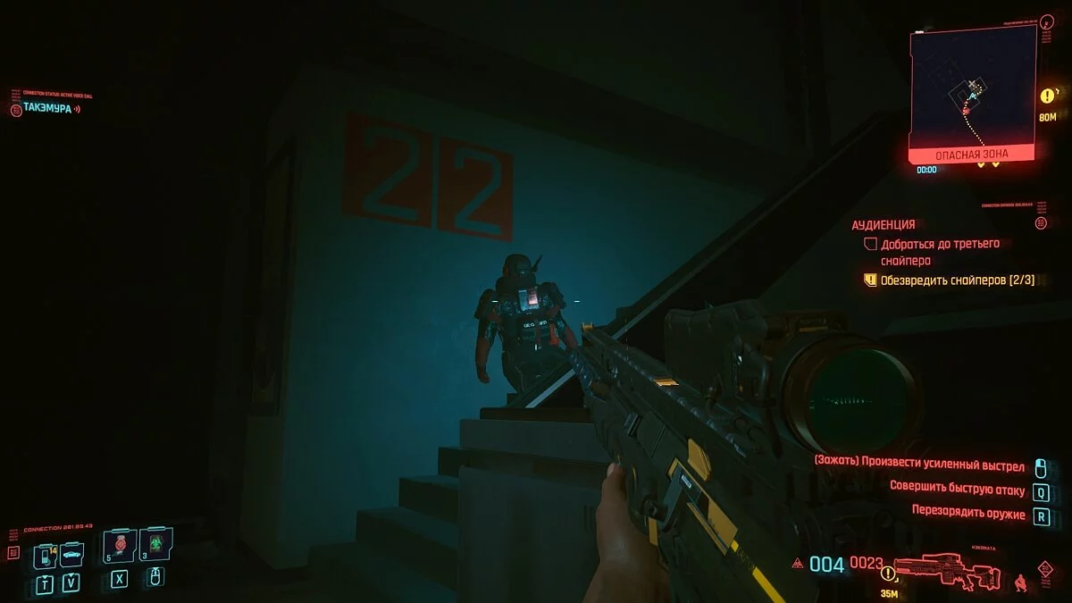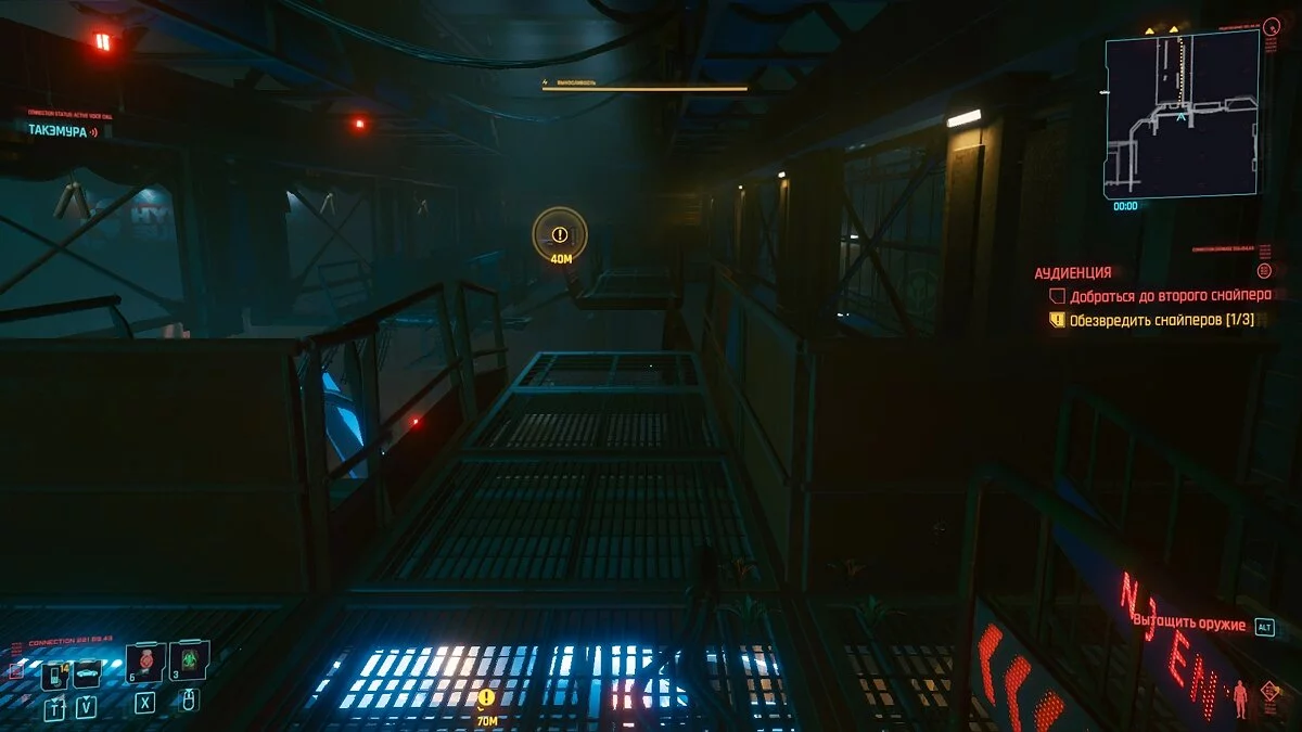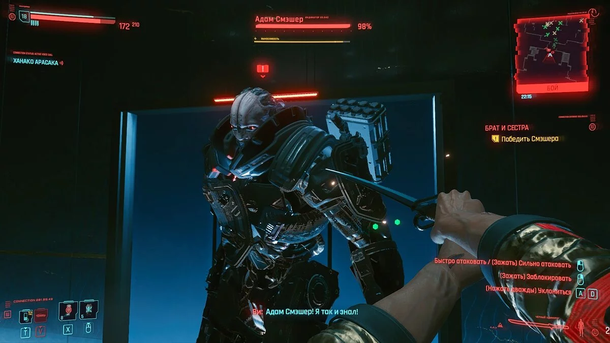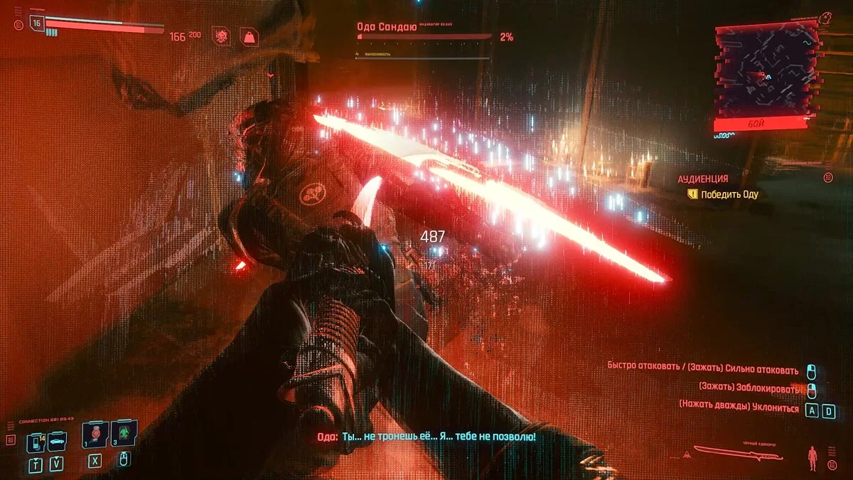 На этом задание не заканчивается. Спуститесь на лифте вниз и следуйте за маркером на карте.Доберитесь до нетраннера и выдерните провод из его головы, после чего на вас нападет босс — Ода. Сперва он начнет атаковать двумя катанами, затем переключится на огнестрельное оружие. Используйте укрытия, чтобы спрятаться от его хаотичных выстрелов и не спеша постреливайте в него. Если у вас развиты способности холодного оружия, то вы можете попробовать убить его в ближнем бою с помощью катаны.
