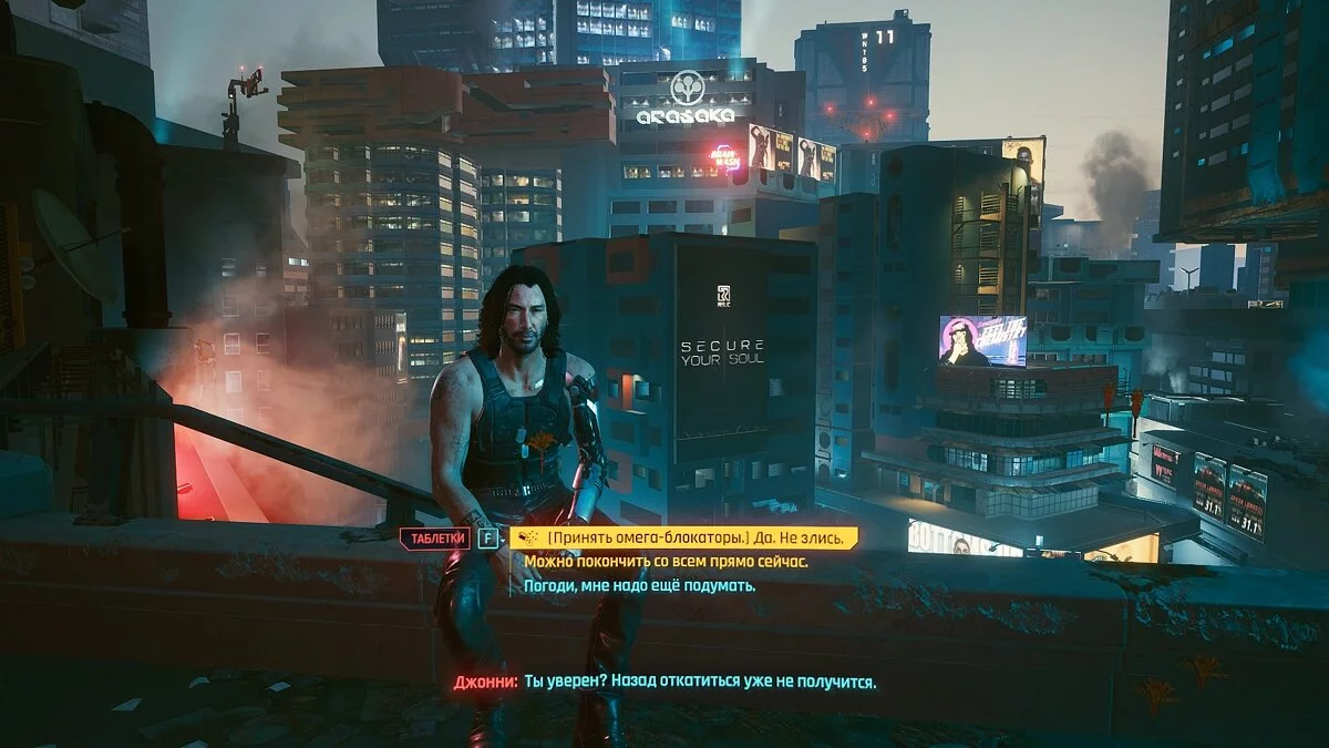 Здесь вы можете получить первую концовку в Cyberpunk 2077, если решите покончить со всем раз и навсегда. Выберите пункт [Можно покончить со всем прямо сейчас], чтобы Ви застрелился. Если не хотите видеть такой финал, то выберите [Принять омега-блокаторы].