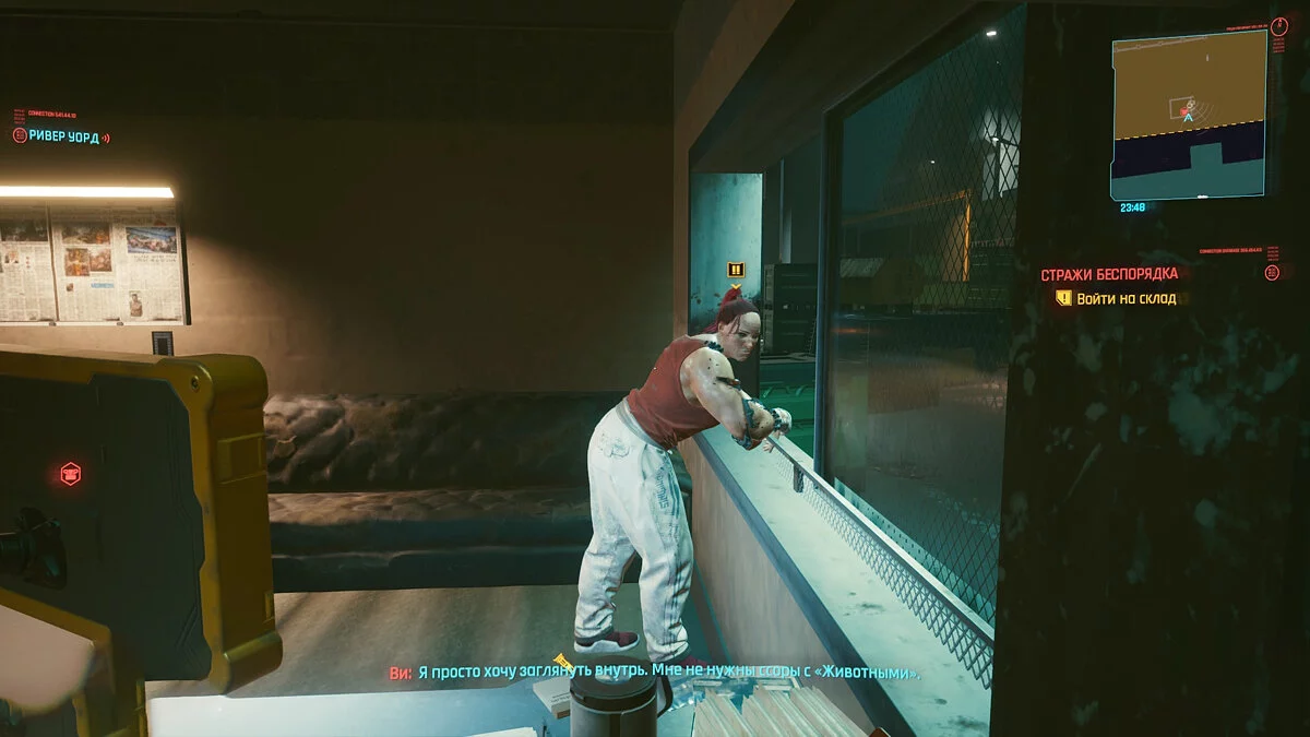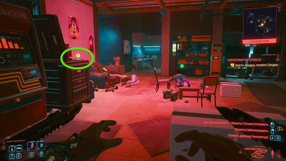 Миссия станет доступна после выполнения дополнительного задания Сильверхенда «Сюрприз!». Отправляйтесь в отмеченное место на карте, поднимитесь на третий этаж и поговорите с Нэнси. Вам нужно выбрать, как действовать: скрытно пронести файлы из здания, либо использовать силу. Если выберите первый вариант, то спуститесь к танцполу и войдите в туалет. Выберитесь через окно и следуйте в соседнюю комнату. Здесь два врага. Первого можно устранить сразу, а второго придется отвлекать, либо перезагружать оптику врага (при наличии достаточного количества памяти кибердеки). Также избавьтесь от нескольких противников в следующей комнате и в коридоре, чтобы встретиться с Нэнси у лифта.
