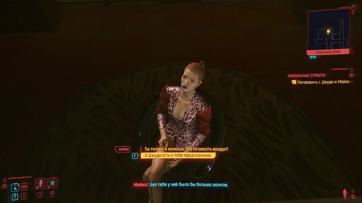 Это задание является прямым продолжением квеста Джуди «Цепная реакция». Доберитесь до уже известного вам клуба «Облака» и следуйте за маркером на карте, пока не окажетесь на нужном балконе. Нажмите соответствующую клавишу, чтобы дождаться Джуди и следуйте к Майко. Неважно, что вы скажете девушке, та в свою очередь откажется помогать вам. Но перед уходом все же даст наводку на одного из людей, которого вы можете устранить. Если хотите сделать это, спуститесь на технический этаж и убейте его. Покиньте мегабашню чтобы завершить квест.