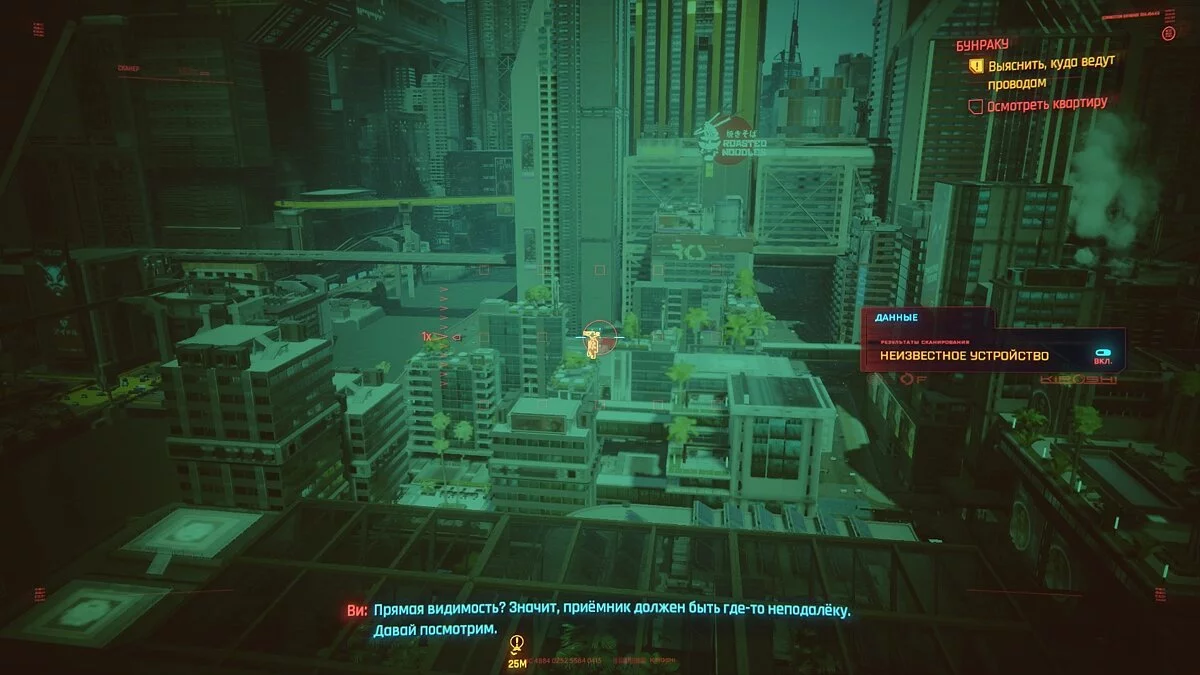 Позвоните Нэнси и узнайте детали миссии. Она расскажет о нескольких передатчиках, которые транслируют странные сообщения по всему Найт-Сити. Отправляйтесь к первому и найдите его на третьем этаже здания (сюда можно добраться по металлической лестнице).