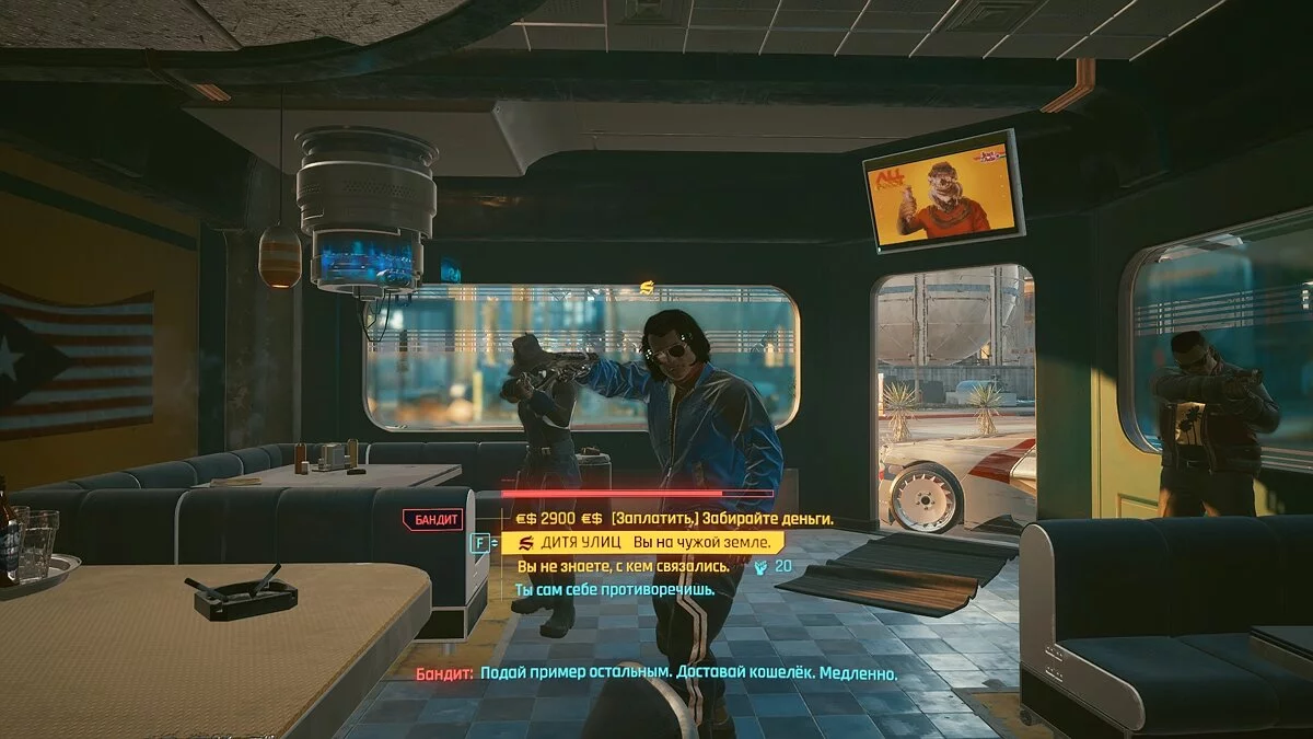 Неподалеку от завода, на территории которого вы разбирались с «Мусорщиками» по квесту «Масло в огонь», вы найдете небольшую забегаловку. Войдите в кафе и закажите любой напиток. В этот момент на вас нападут грабители, а игра предложит вам выбор (увы, наказать грабителей не удасться):