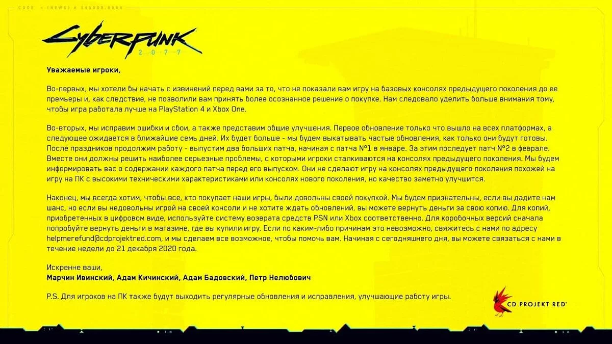 Обратите внимание! Речь идет исключительно о цифровой версии Cyberpunk 2077. Владельцам коробочных изданий предлагается решать вопрос непосредственно с тем магазином, где они приобрели игру. Если вам отказываются возвращать деньги — рекомендуются связаться напрямую с разработчиками по адресу helpmerefund@cdprojektred.com. Сделать это нужно до 21 декабря 2020 года.