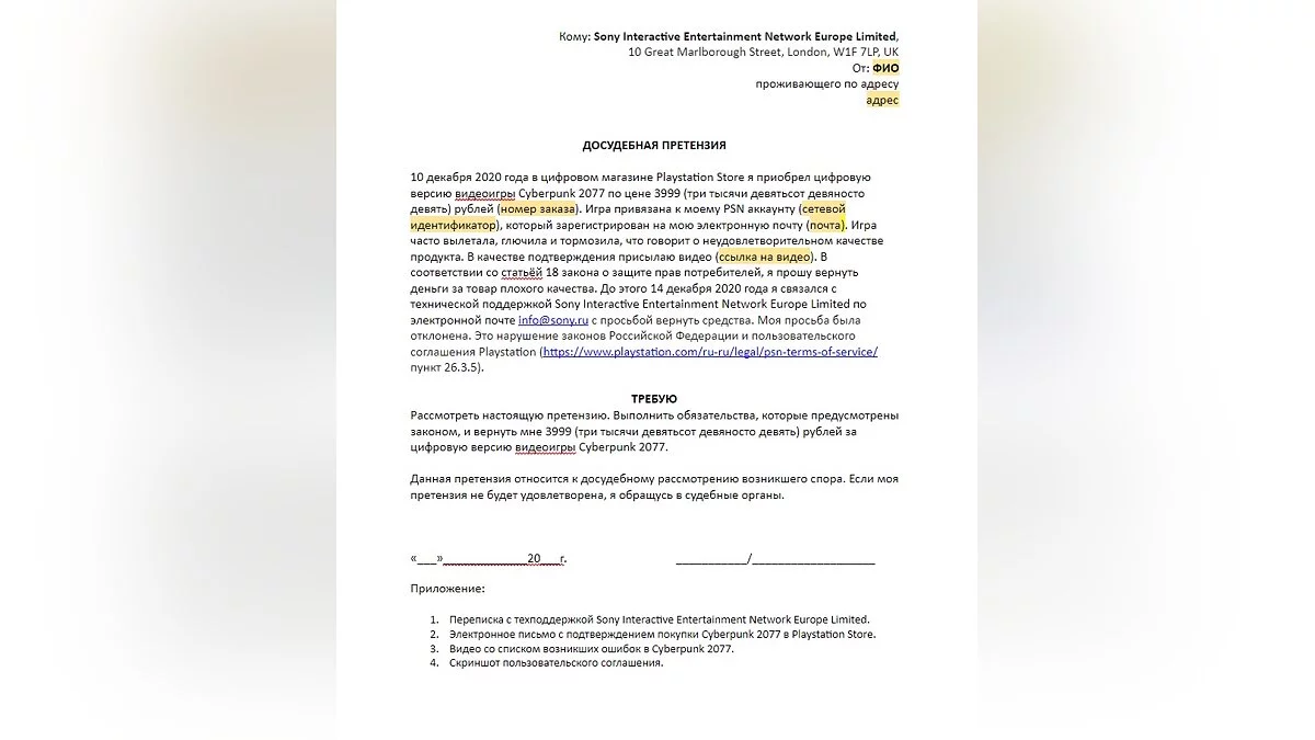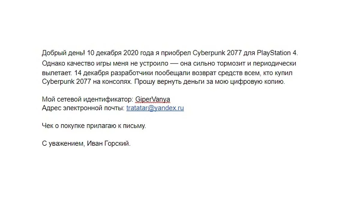 - Приложите к письму чек о покупке Cyberpunk 2077, который должен был прийти на вашу почту, и отправляйте их на адрес технической поддержки — info@sony.ru.