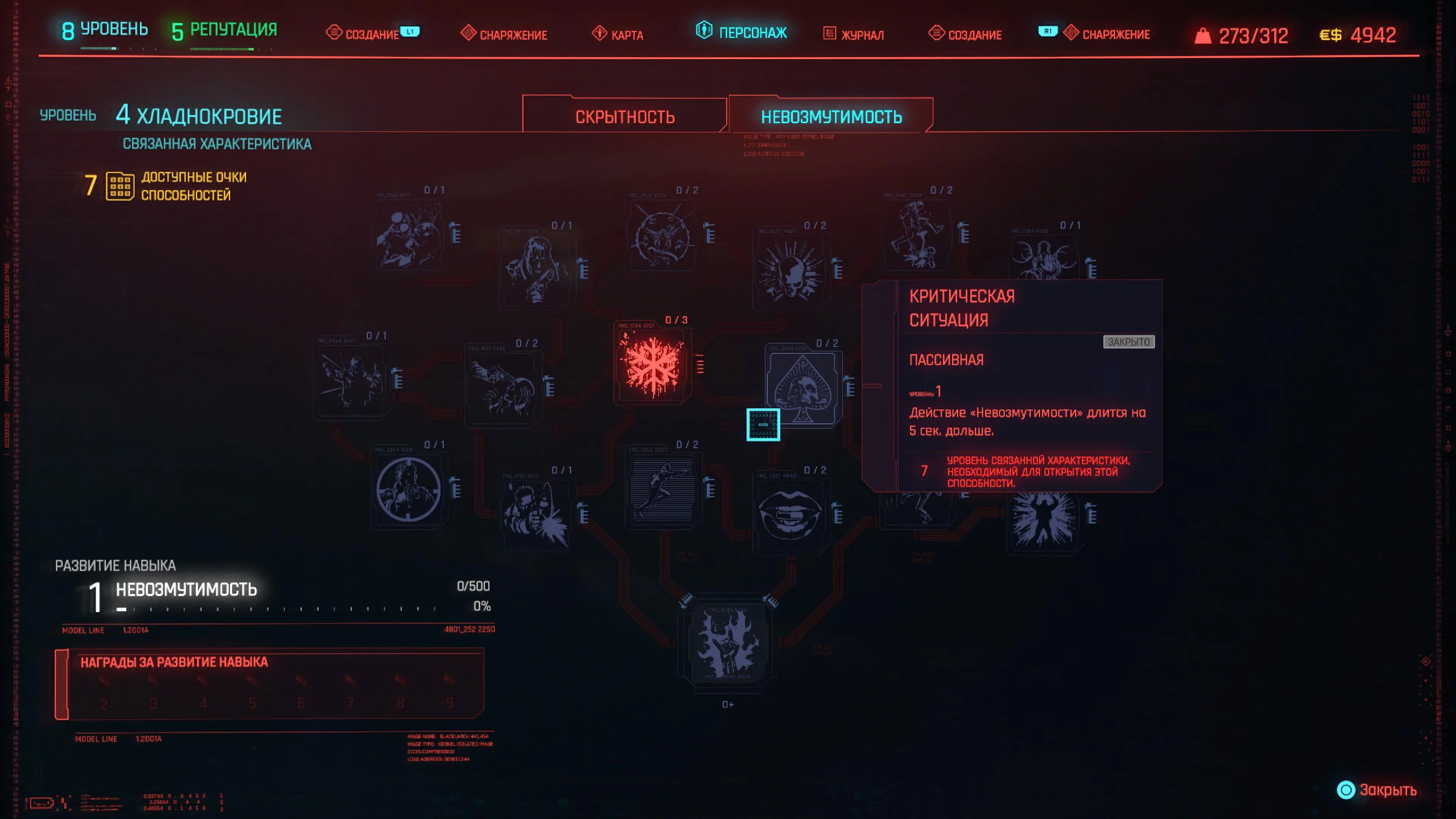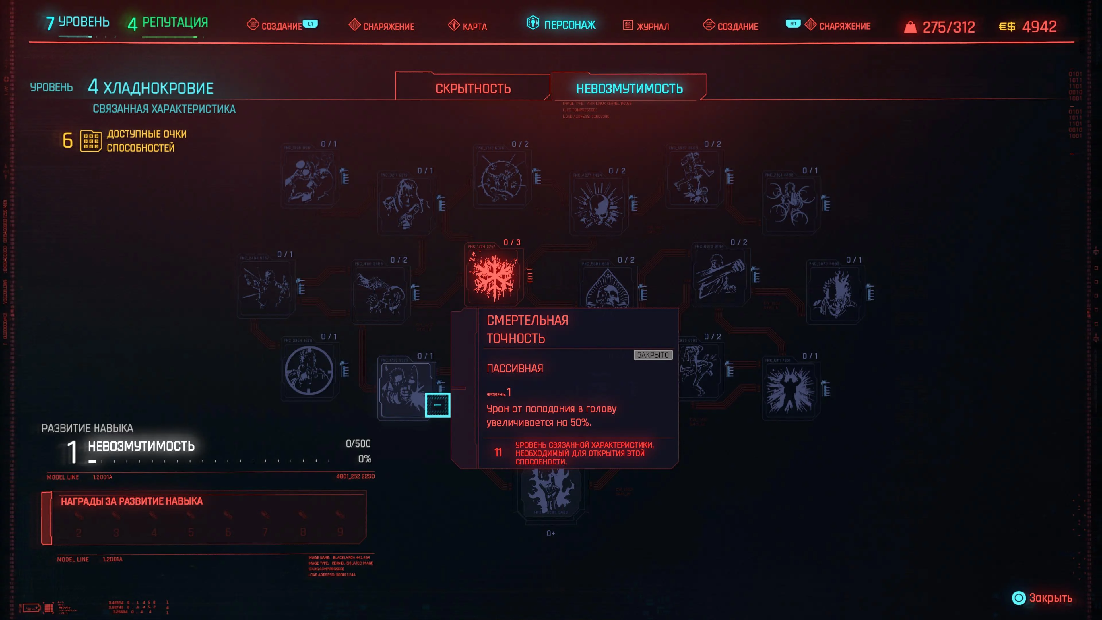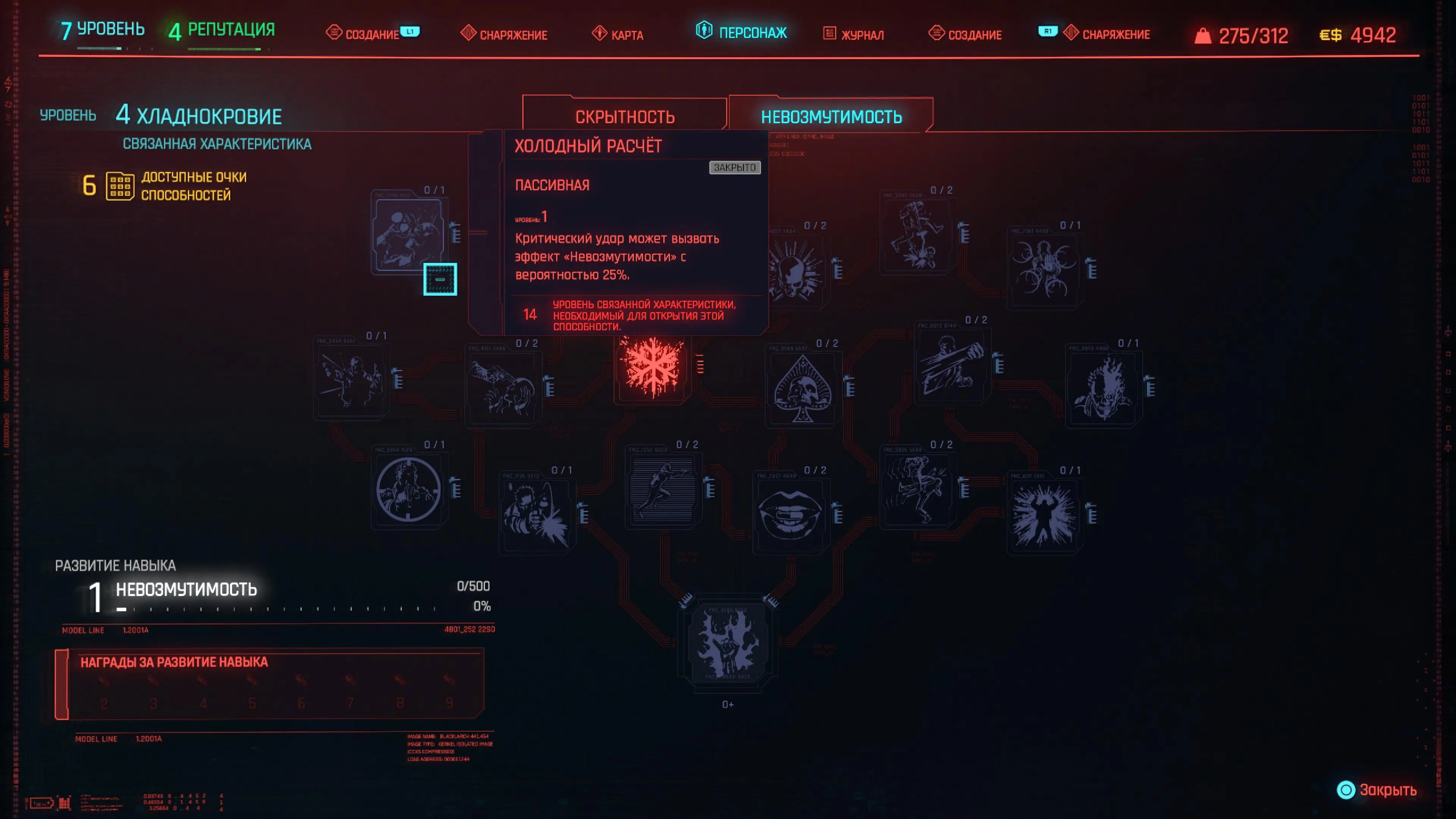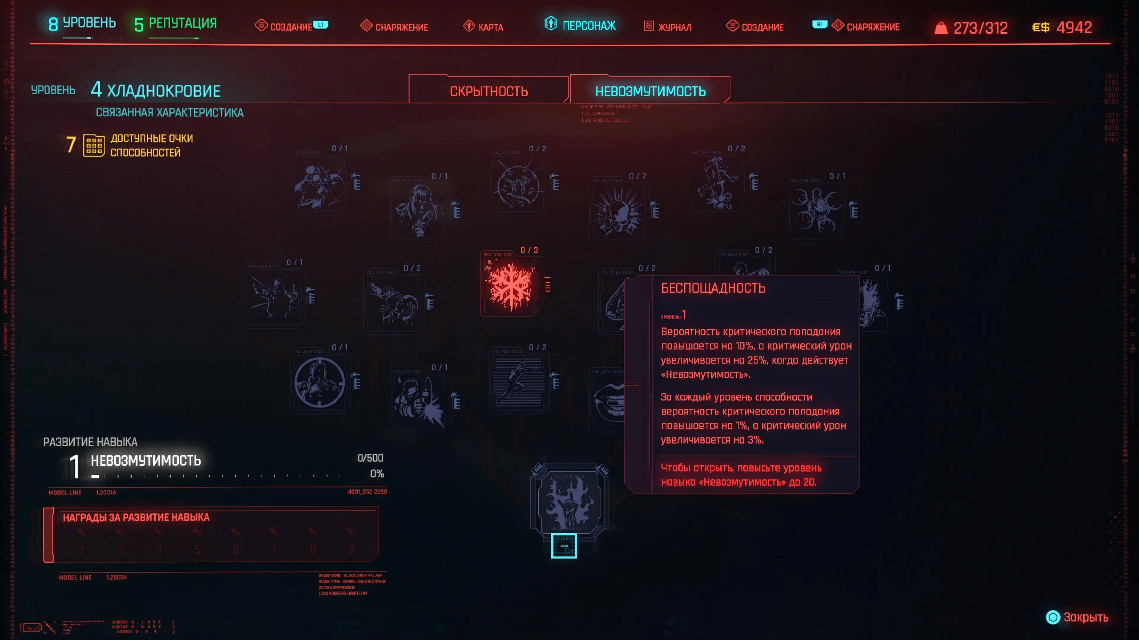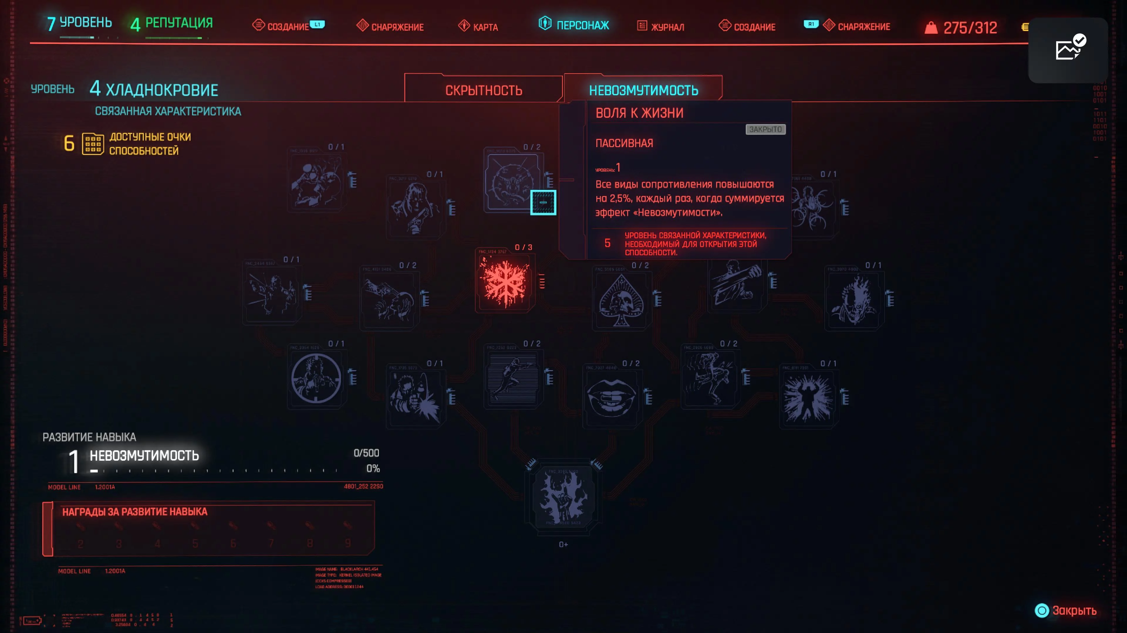Реакцию и силу прокачиваем равномерно. Это потому, что от них нам нужны пассивные эффекты, которые не только помогут выжить, но и улучшат урон. Хладнокровие оставляем напоследок, потому что здесь нужны серьезные вложения очков, чтобы заметить большую разницу.
