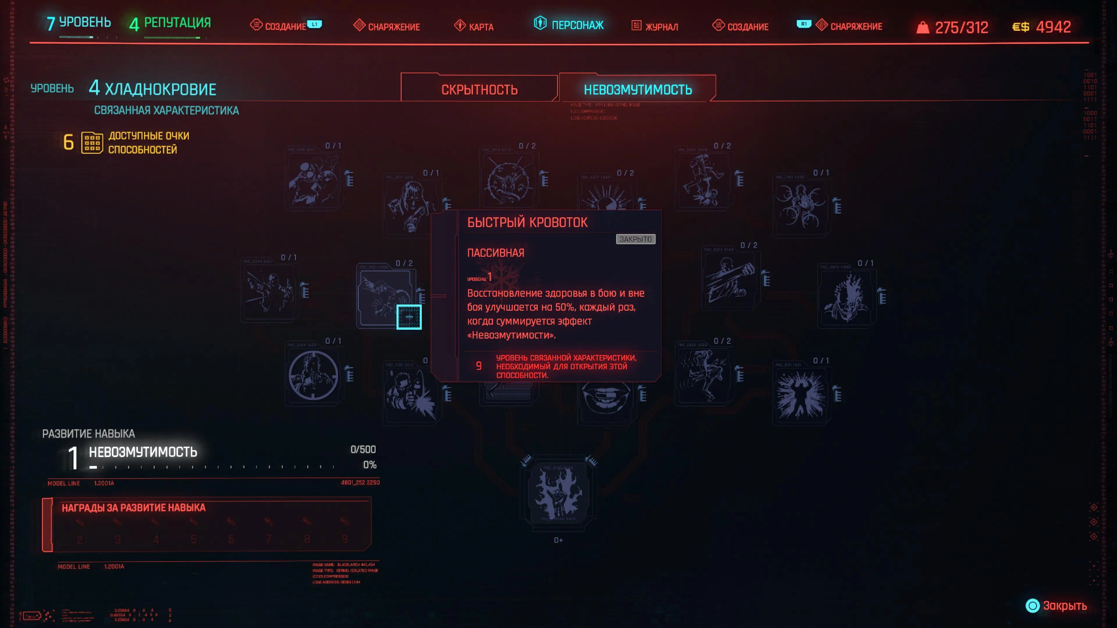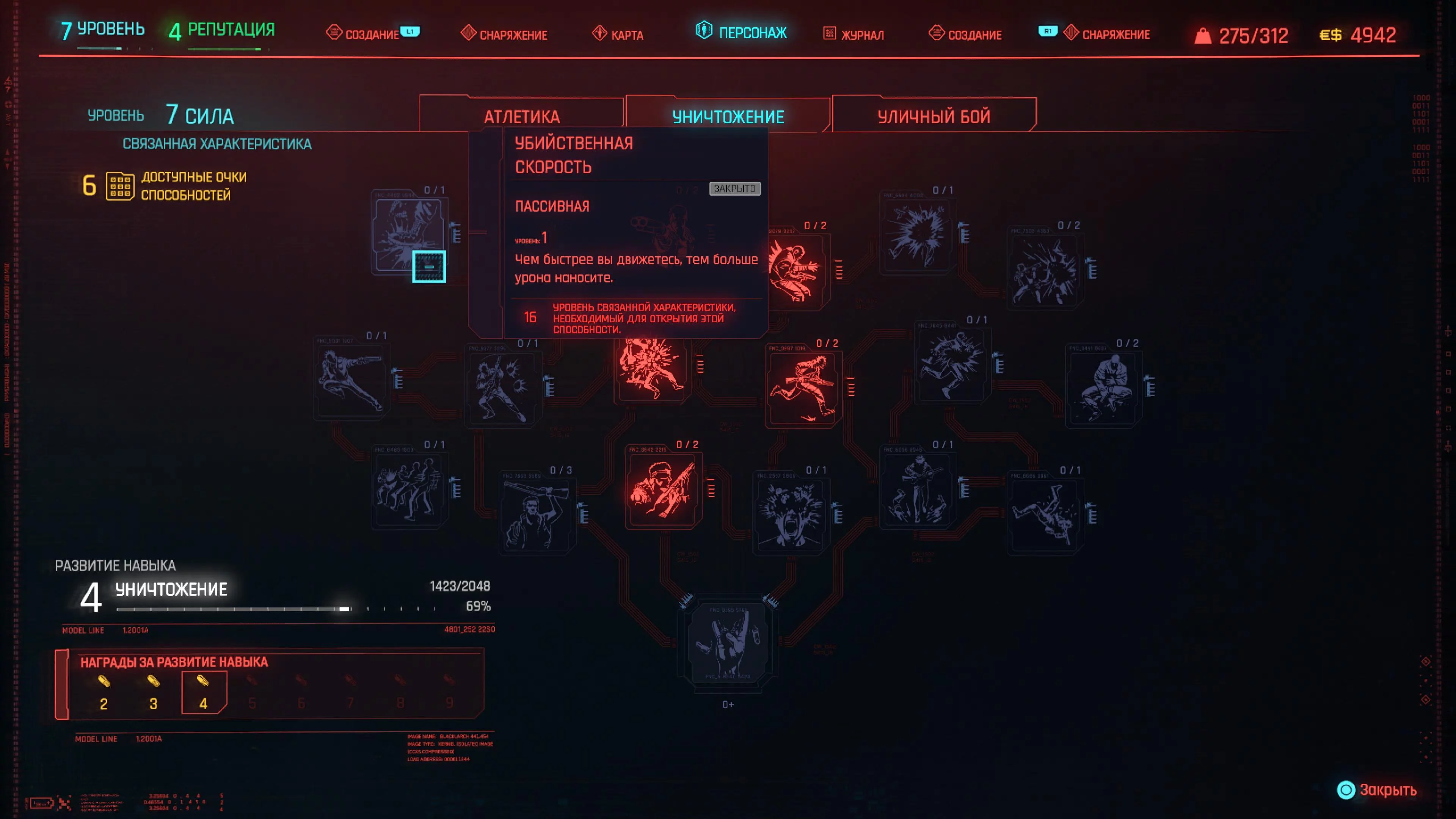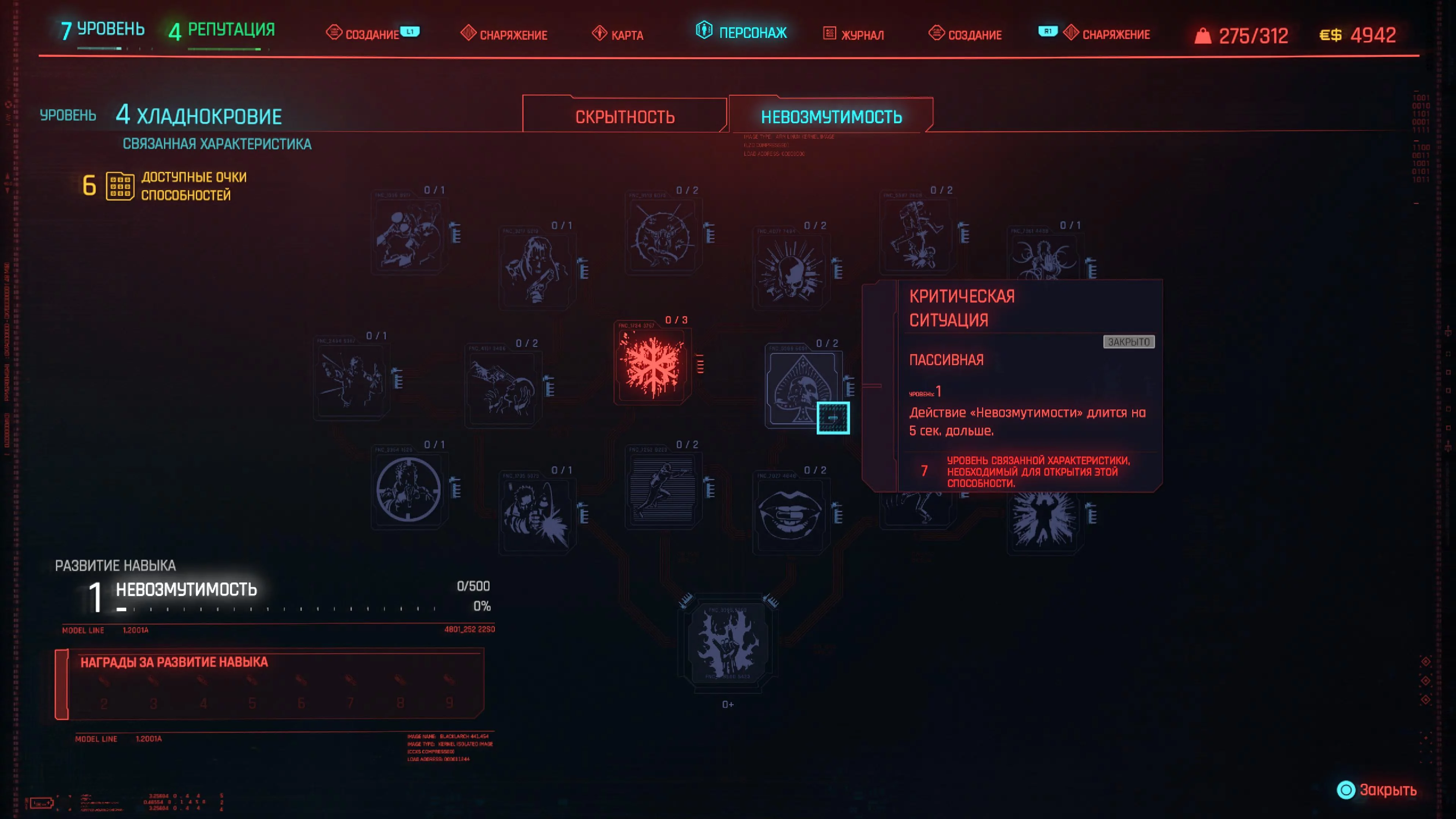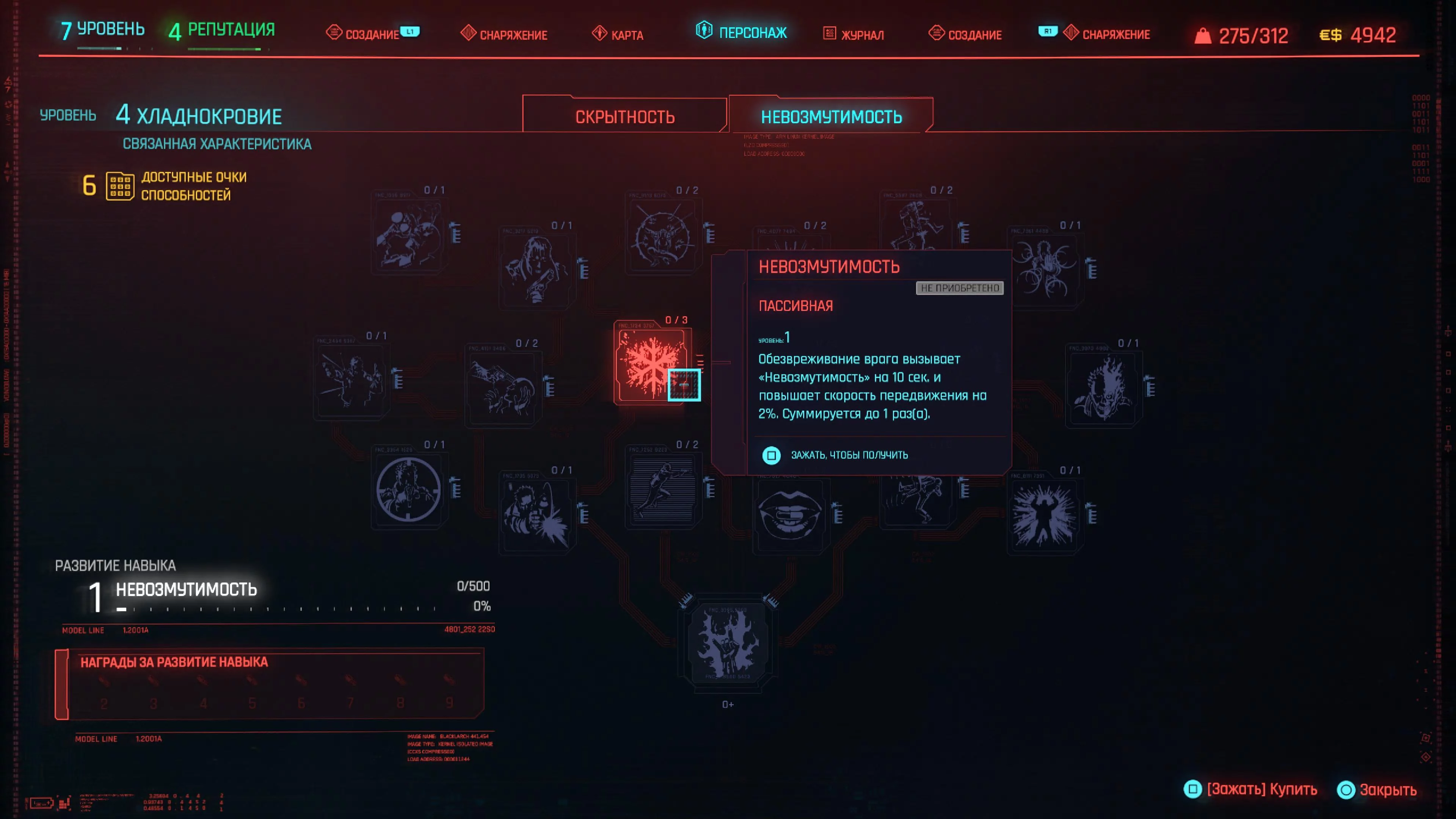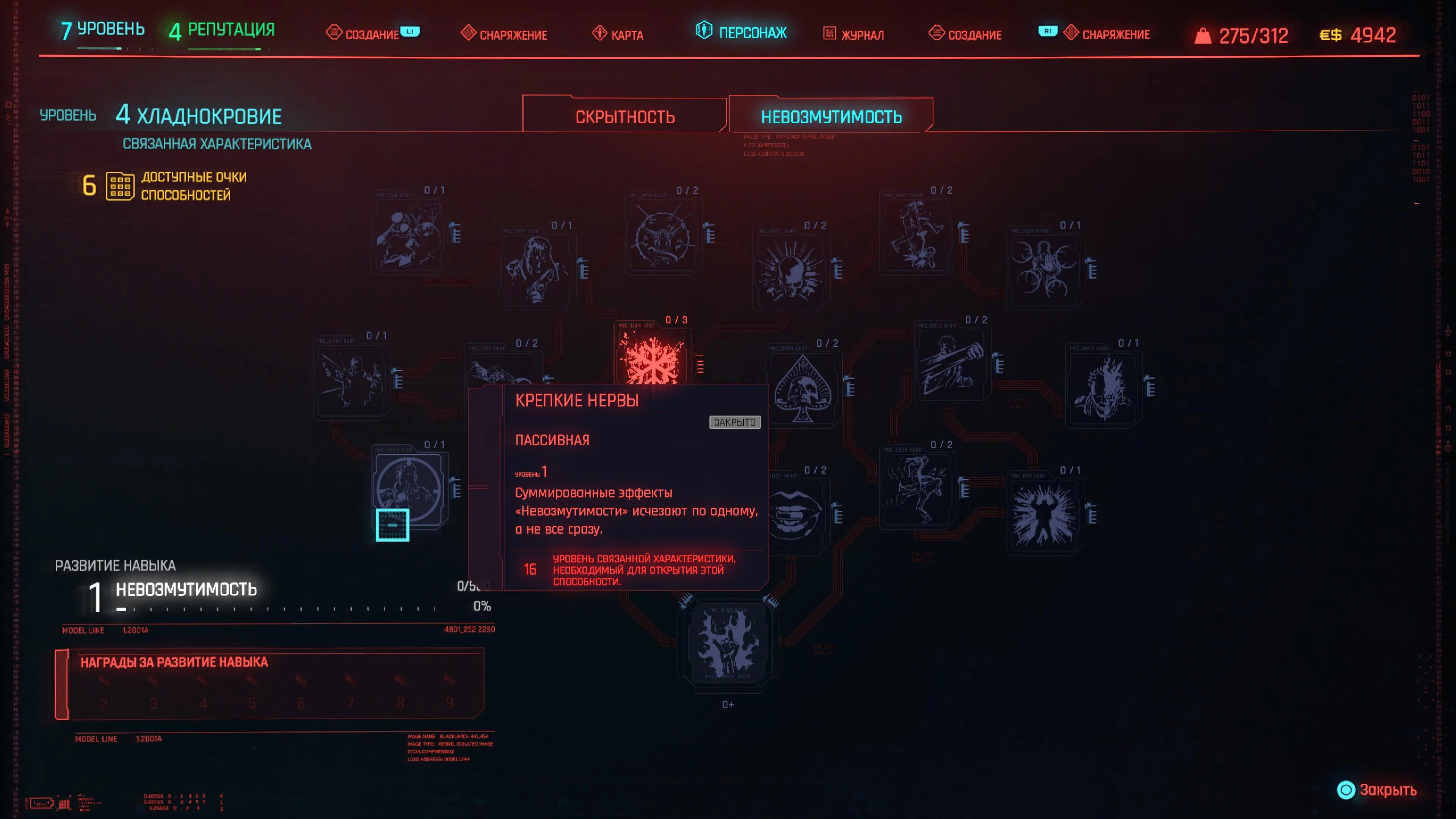 Реакцию и силу прокачиваем равномерно. Это потому, что от них нам нужны пассивные эффекты, которые не только помогут выжить, но и улучшат урон. Хладнокровие оставляем напоследок, потому что здесь нужны серьезные вложения очков, чтобы заметить большую разницу.