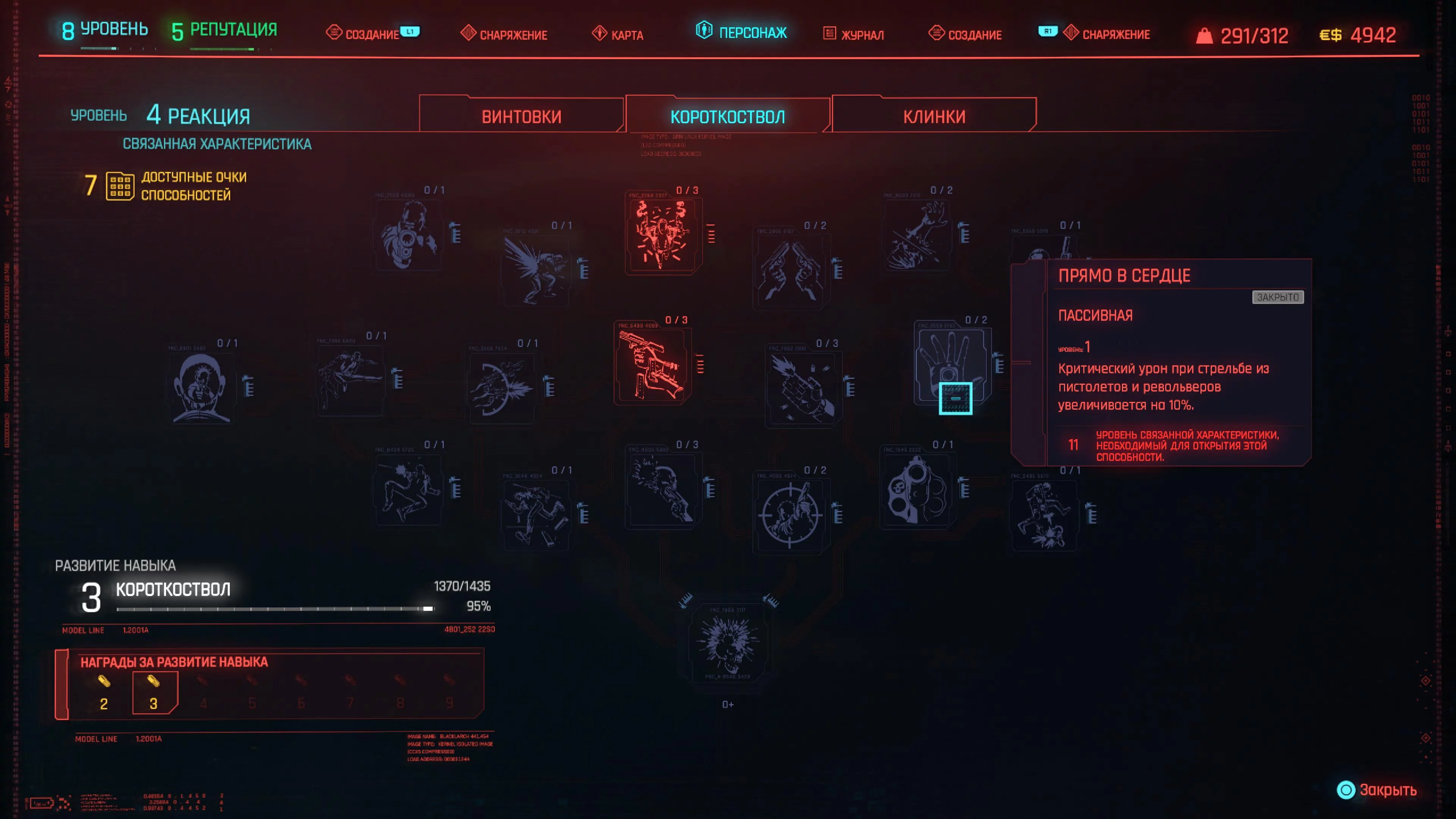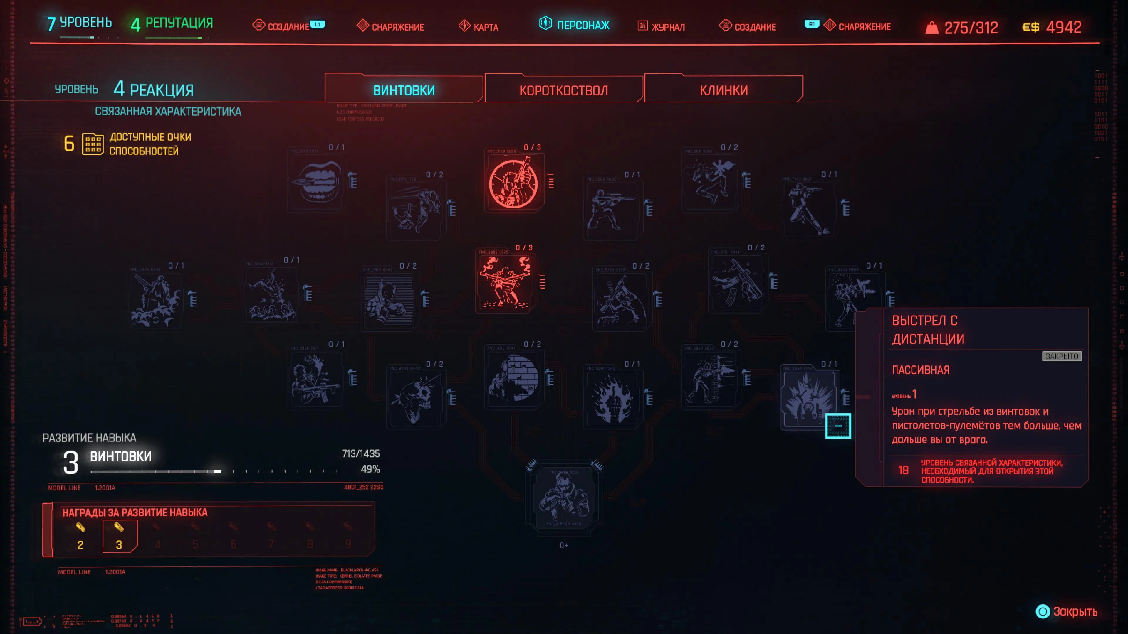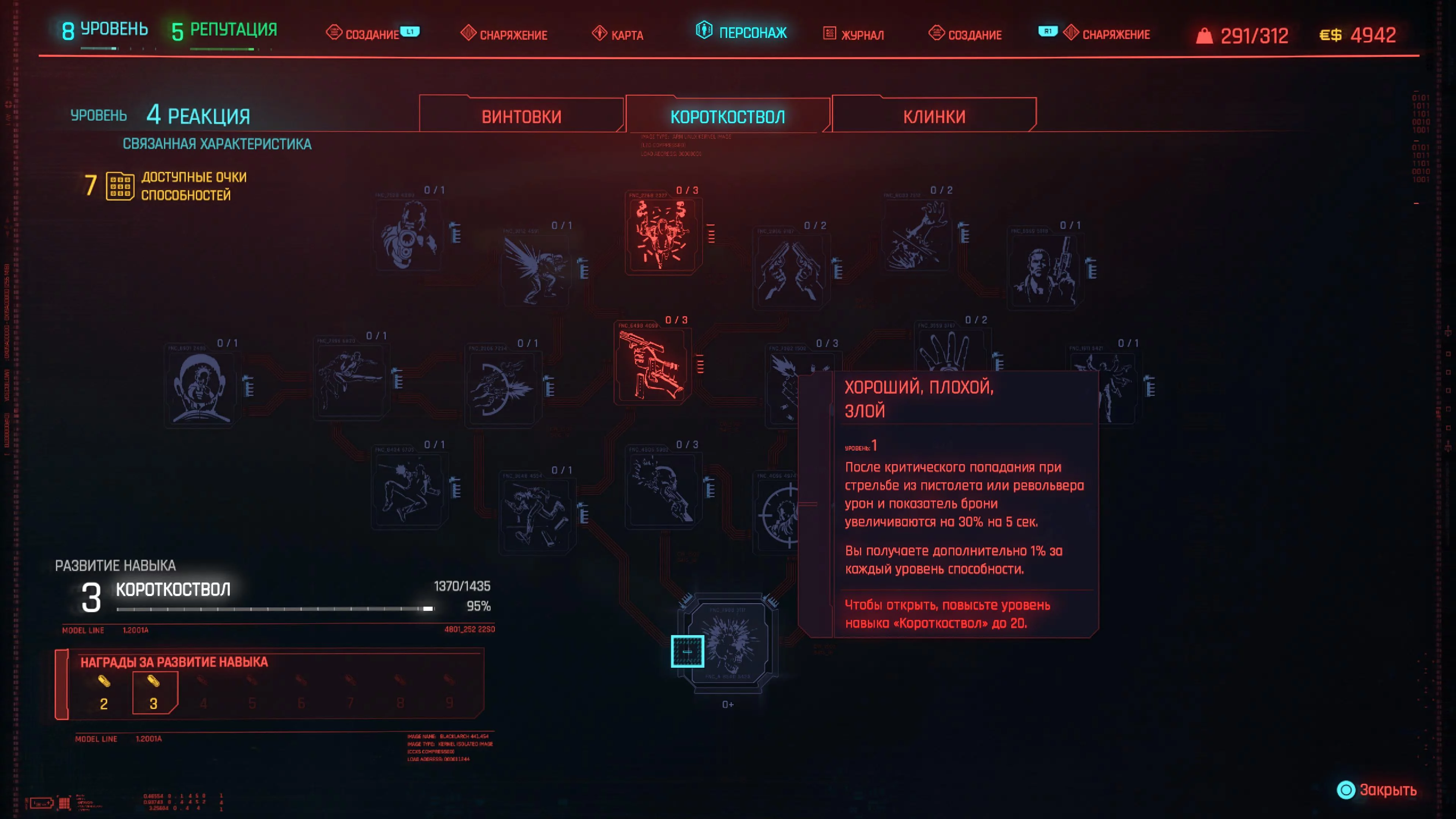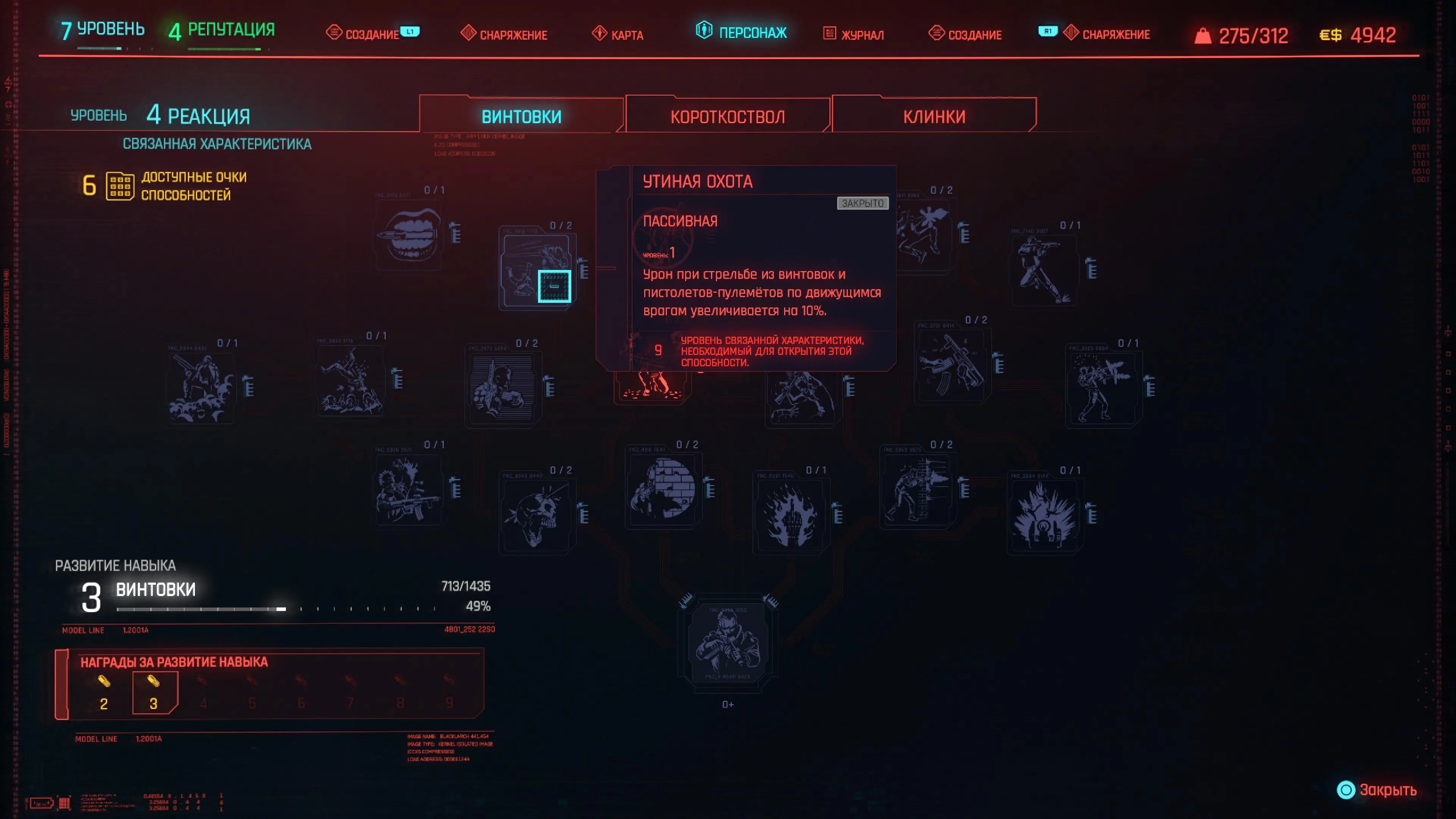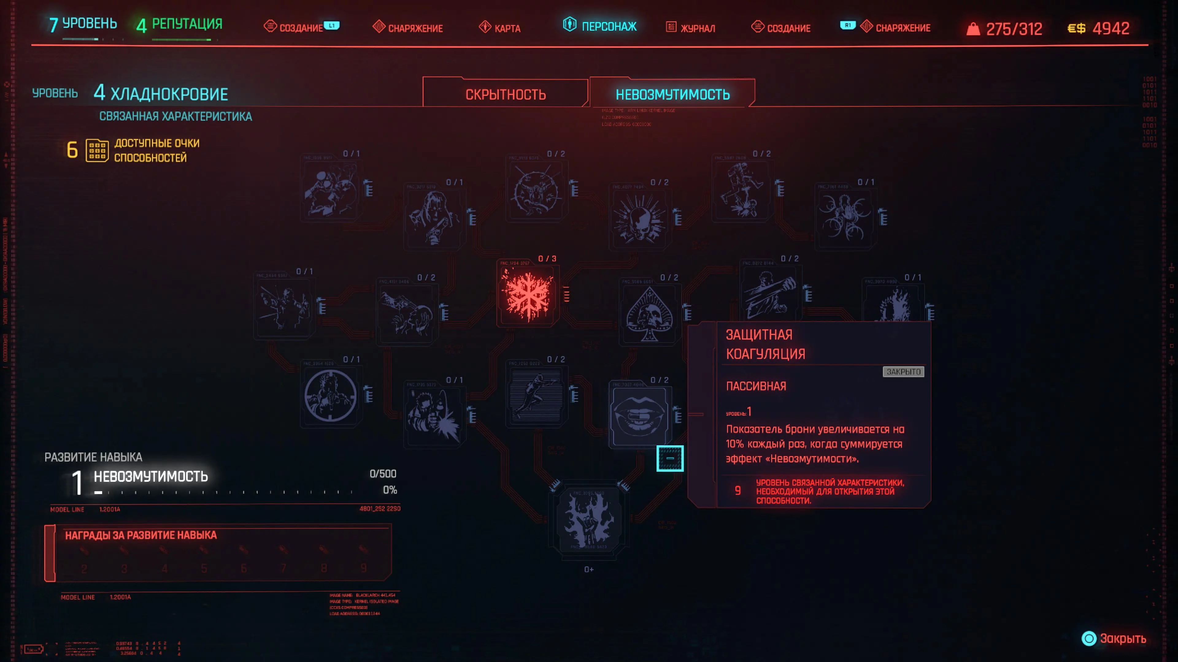 Реакцию и силу прокачиваем равномерно. Это потому, что от них нам нужны пассивные эффекты, которые не только помогут выжить, но и улучшат урон. Хладнокровие оставляем напоследок, потому что здесь нужны серьезные вложения очков, чтобы заметить большую разницу.