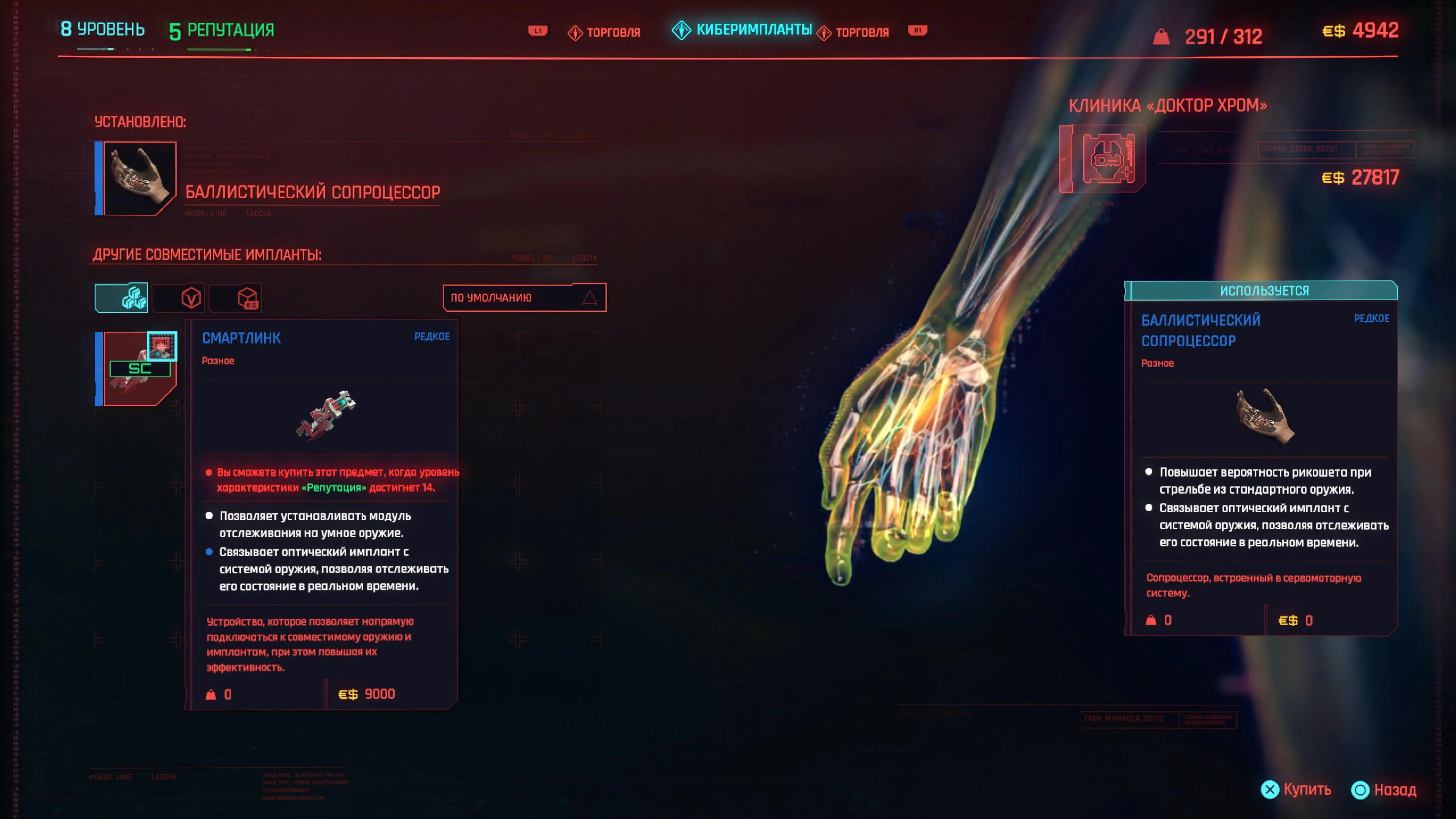 Имплант «Смартлинк» (Smart Link) чрезвычайно важен для этой сборки для использования автоприцела. Обязательно купите его у рипера как можно скорее. «Синаптический ускоритель» (Synaptic Accelerator) замедляет время, когда вы вступаете в бой. Это может позволить вам убить одного или двух врагов еще до того, как они сдвинутся с места. «Керезников» (Kerenzikov) также отличный выбор.