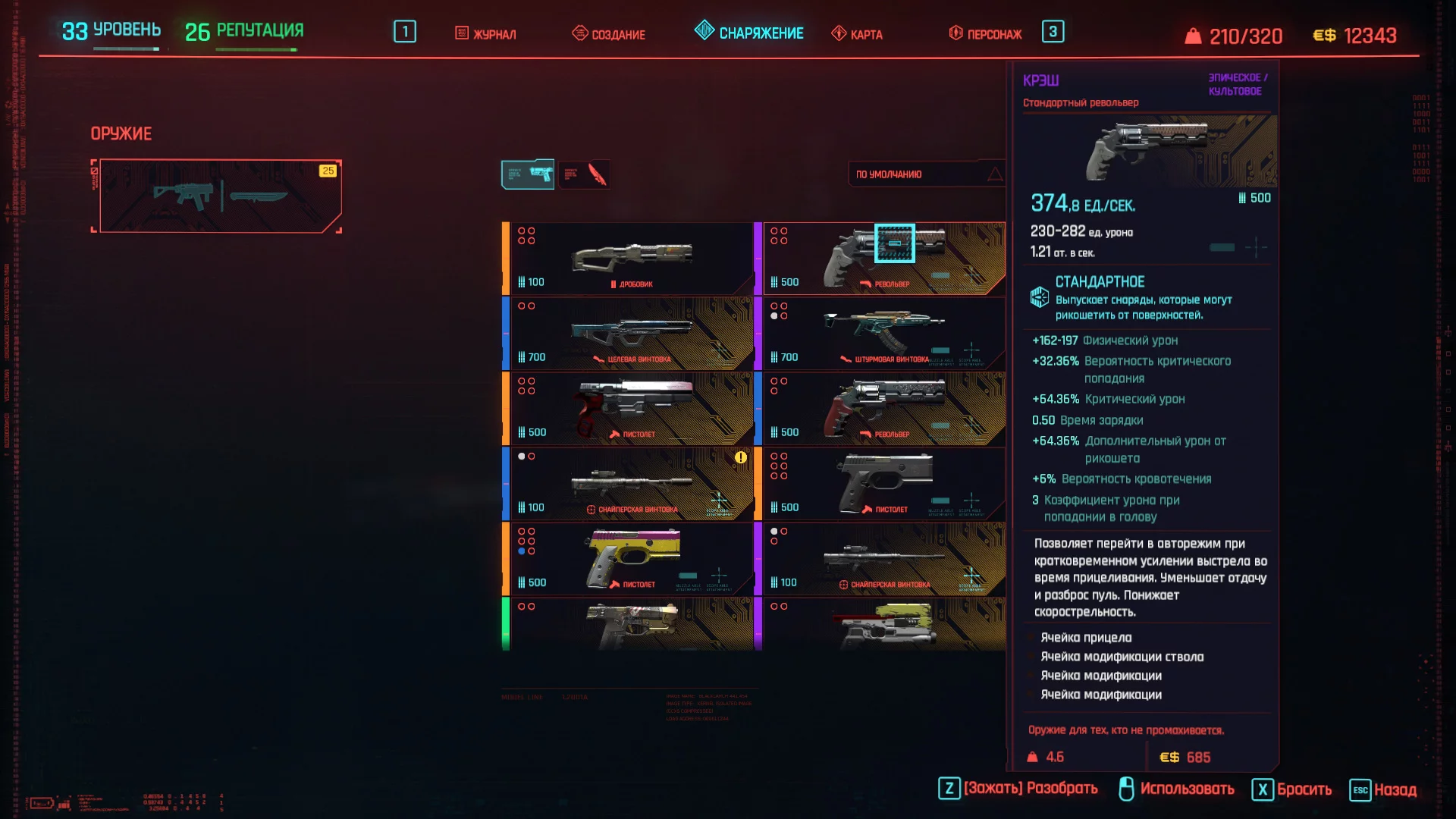 Оружие, которое вам нужно для этой сборки, — это пистолет или револьвер с очень высоким уроном за выстрел, не смотрим на урон в секунду. Вам нужно убивать врагов одним выстрелом, поэтому урон в секунду не важен. Обратите внимание на показатель «Коэффициент урона при попадании в голову», убедитесь, что у вашего оружия он равен 3 или больше.