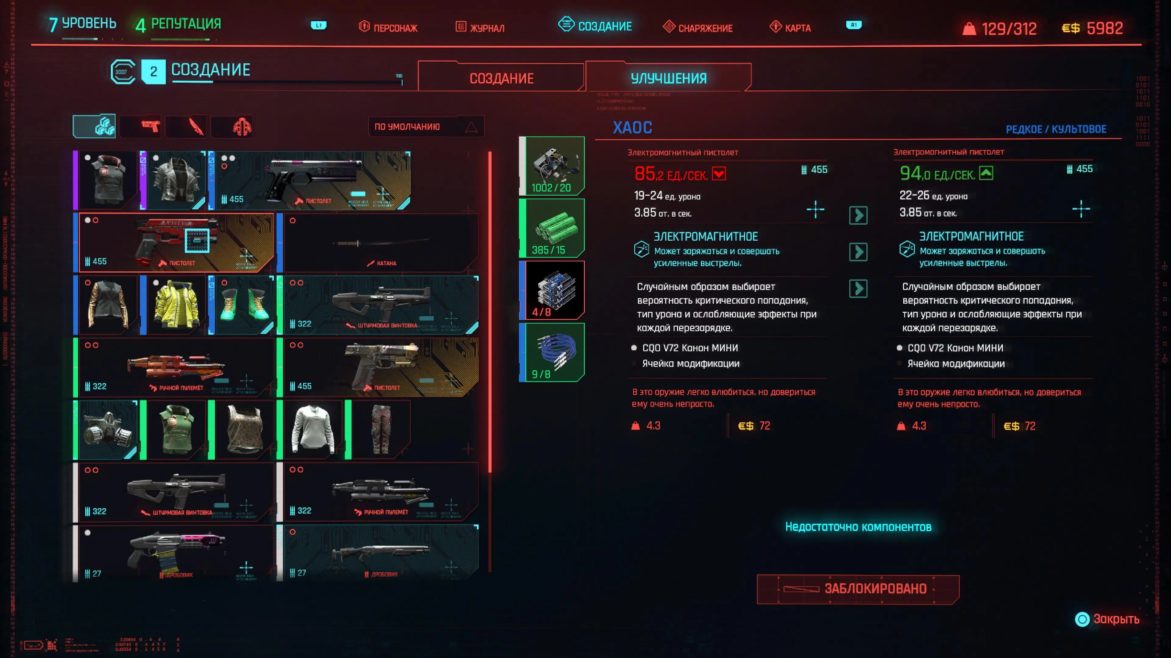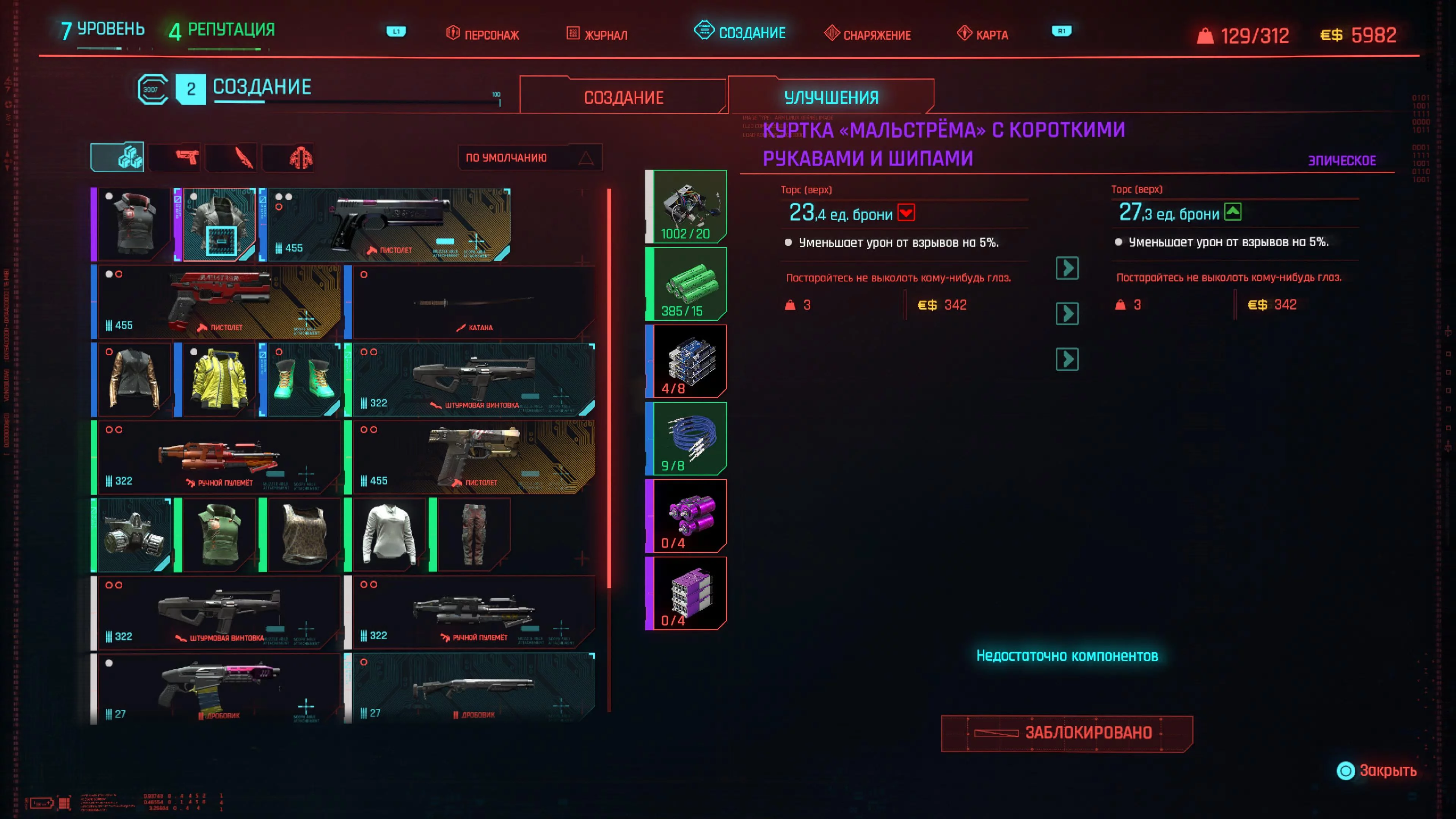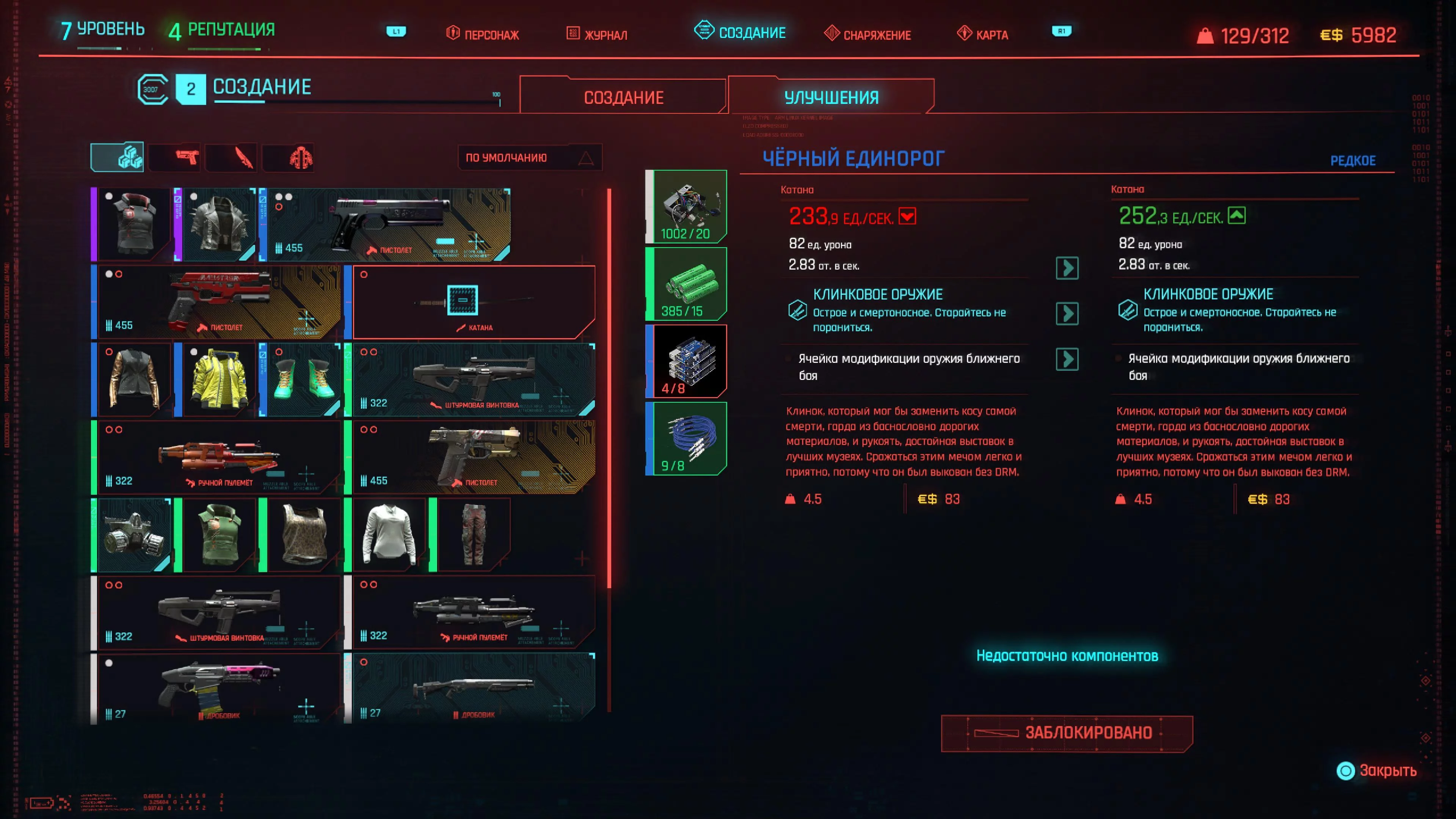 Количество ресурсов, которое вам понадобится, будет зависеть от редкости улучшаемого снаряжения. Обычное оружие (белое), потребует обычных и необычных компонентов предметов. Для более редкого снаряжения потребуются материалы, которые вы, возможно, не сможете получить так быстро и легко. Независимо от того, что именно вам нужно, эти материалы обычно можно получить, грабя тела врагов или контейнеры, разбросанные по всему миру Cyberpunk 2077. Также можно разбирать ненужные предметы или купить в магазине, если есть лишние деньги.