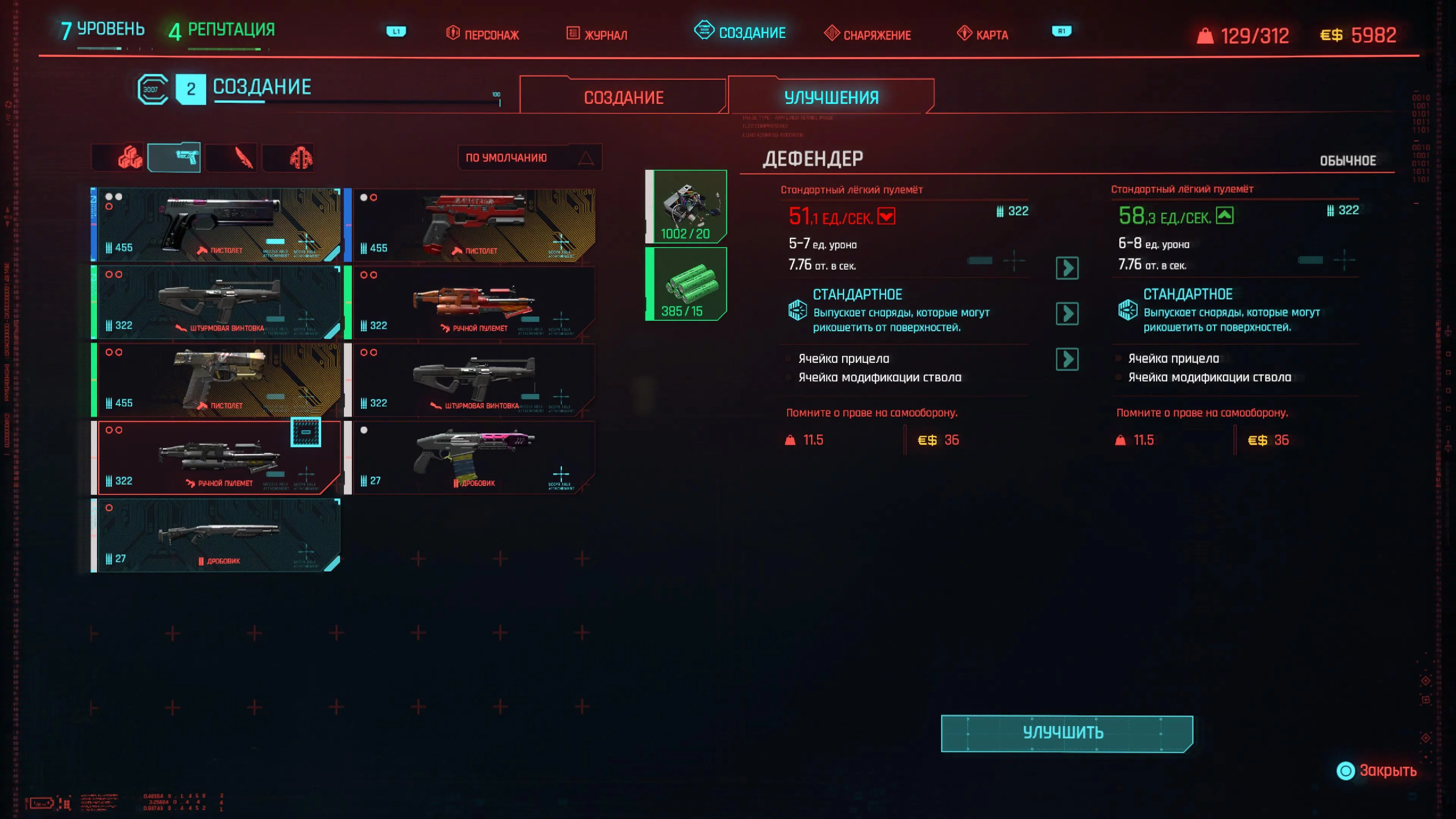 В меню заходим на вкладку Создание / Улучшения. Здесь вы сможете использовать ресурсы для прокачки своего оружия и снаряжения.