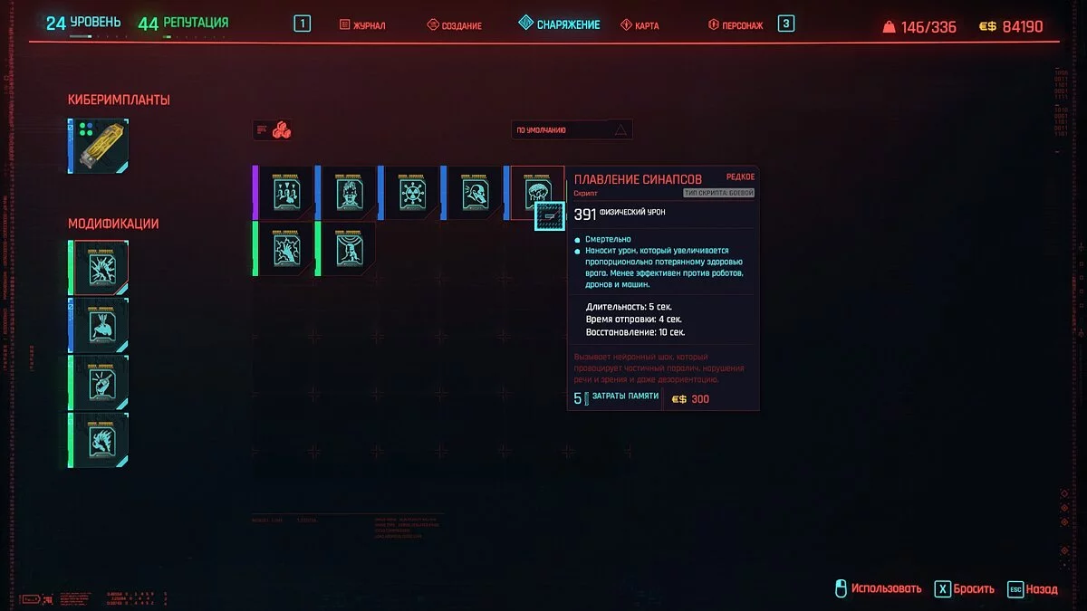 Функционал скриптов довольно обширный. Есть программы, замыкающие импланты противника и наносящие большой урон. Есть «Перезагрузка оптики», которая отключает обзор врага на несколько секунд и подходит для незаметного перемещения по локации. Используя «Перегрев», вы сможете нанести противнику непрерывный урон от горения. Как вы понимаете, каждый скрипт — это особая способность, которая упрощает прохождение и позволяет на равных сражаться с высокоуровневыми врагами.