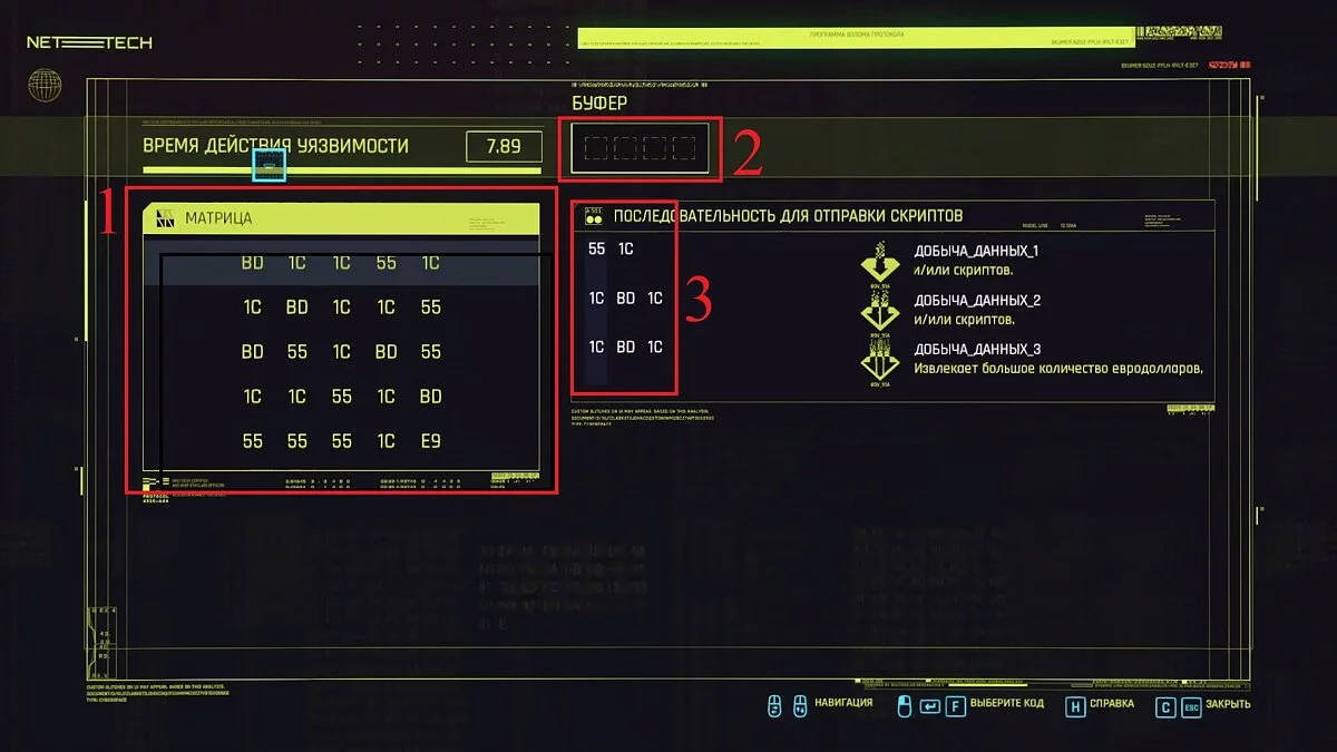 - Последовательности (комбинации) символов, которые необходимо ввести в окно для ввода. В примере на картинке это «55-1C», «1C-BD-1C», «1C-BD-1C». Если вы хотите получить максимальную награду за взлом, вы должны ввести все три последовательности в окне в том же порядке, в каком они вам представлены.