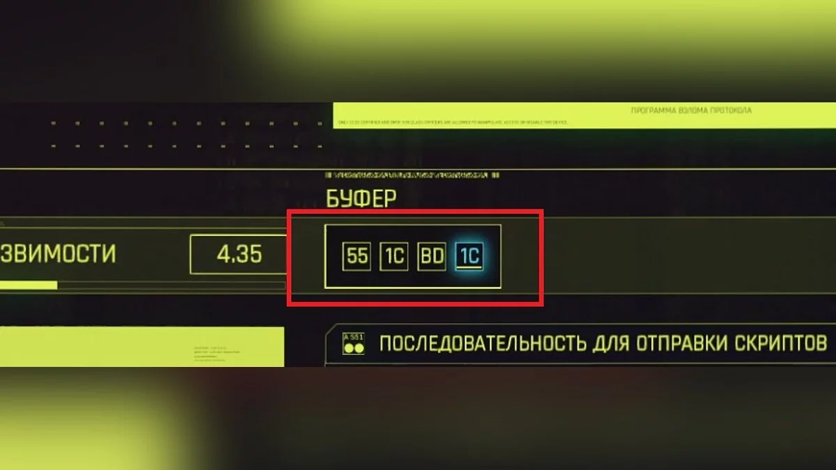 - Окно для ввода символов (буфер). Порой в нём не четыре, а куда больше ячеек. Сюда вводятся выбранные символы из таблицы. Как только во всех ячейках окажутся символы, мини-игра завершится.