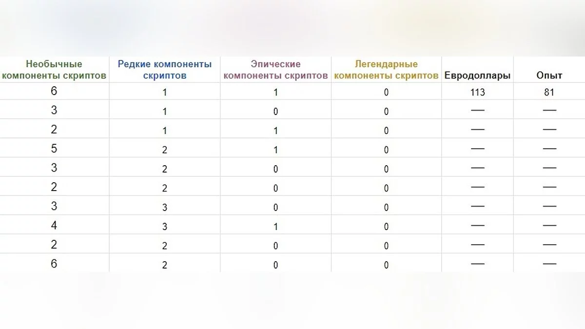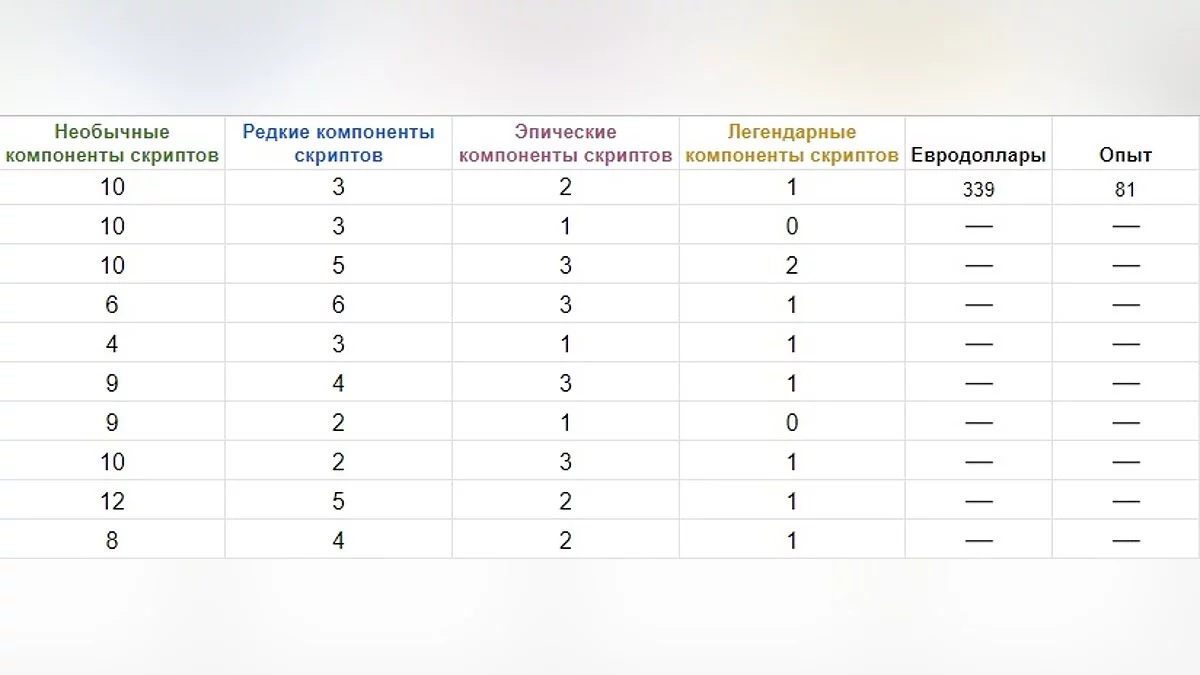Для начала давайте проанализируем, как сильно отличается награда в зависимости от закрытой последовательности. Мы попробовали по 10 раз закрывать каждую из трёх комбинаций отдельно, чтобы составить таблицы, которые могут дать небольшое представление о различии наград в зависимости от последовательности. Стоит отметить, что количество получаемого опыта не зависит от вводимой комбинации. Число евродолларов зависит от последовательности, но количество денег не генерируется случайным образом. А вот за количество компонентов скриптов отвечает рандом и закрытая последовательность.