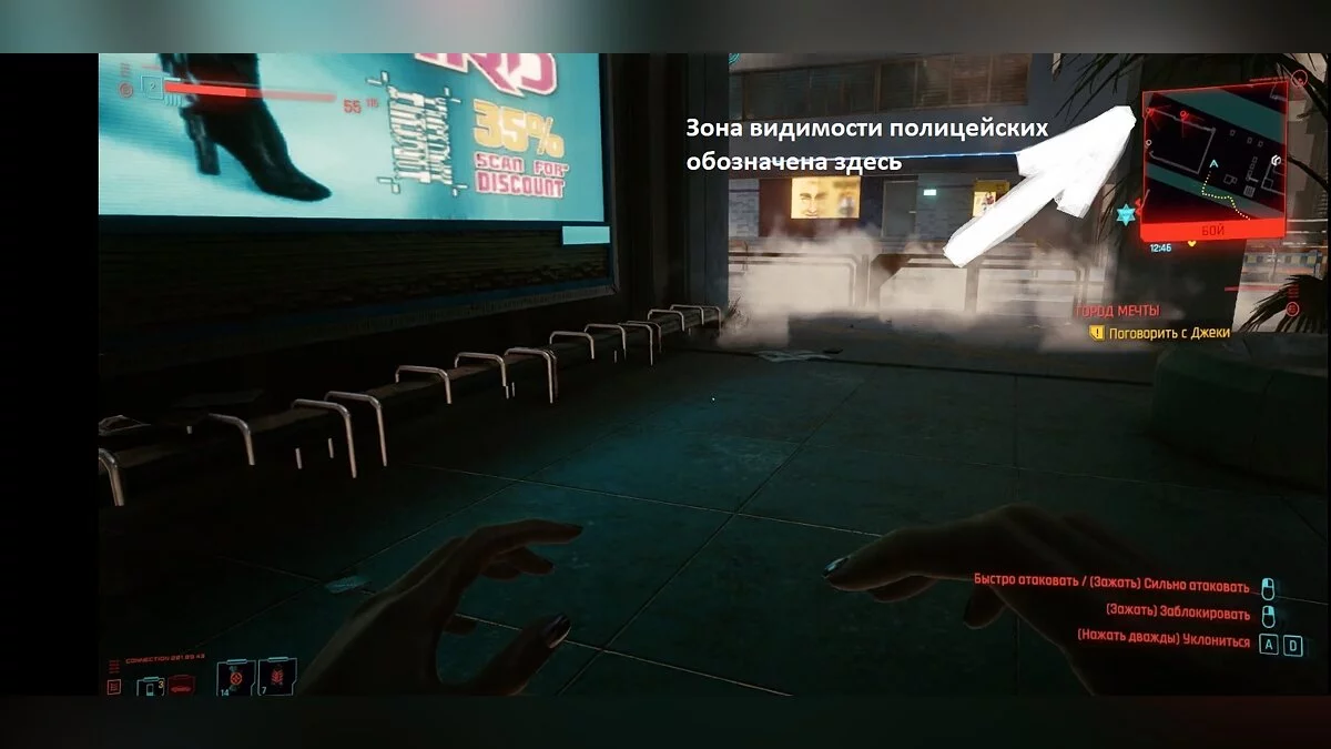 К тому же уйти от преследования в Cyberpunk 2077 несложно. Самый очевидный способ — выйти за пределы зоны видимости полицейских. Направление их взглядов обозначено на мини-карте.